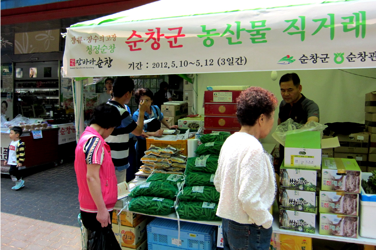 - 순창군이 서울 강서농협 하나로마트에서 지난 10일부터 12일까지 3일간 직거래장터를 운영해 1300만원의 수익을 올렸다. 순창군이 주최하고 순창군 관내농협 공동으로 주관한 이날 행사는 서울 강서농협 하나로마트 앞 광장에서 3개부스를 운영하고 농특산물 직거래 판매 및 홍보에 나섰다. -2012. 5. 14-