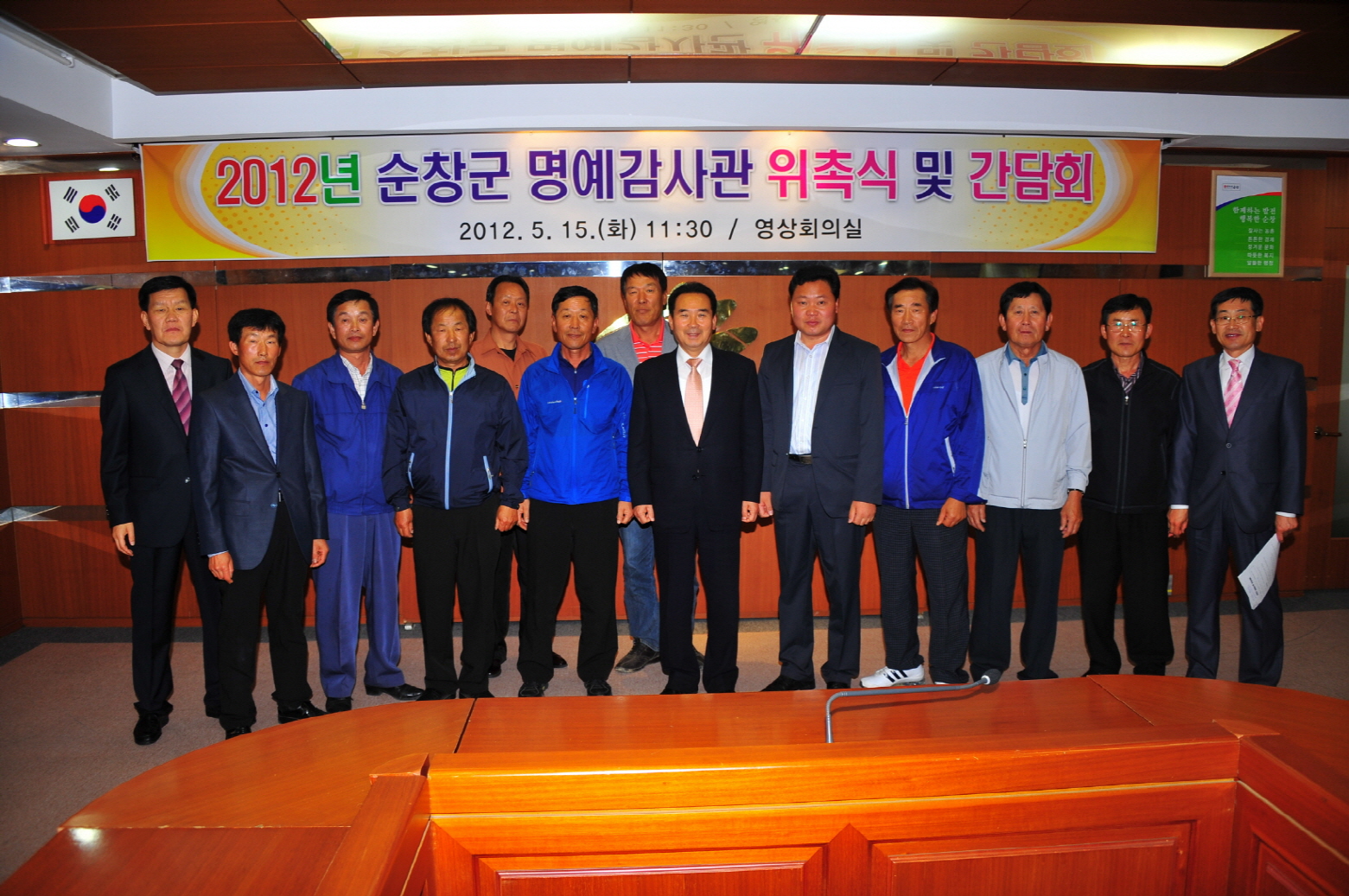 - 투명하고 깨끗한 행정을 최우선 목표로 추진하고 있는 황숙주 순창군수가 15일 군 영상회의실에서 11명의 명예감사관에 대한 위촉장 수여와 간담회를 가졌다. 이날 간담회는 황군수를 비롯해 각읍면별 1명씩의 명예감사관이 참석한 가운데 명예감사관 제도의 활성화와 활동방향에 대한 의견을 수렴하고 감사관의 역할 등에 대한 교육을 하였다 -2012. 5. 15-