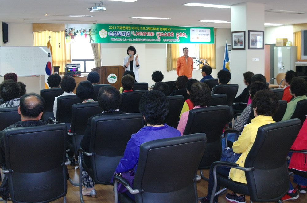 - 문화체육관광부가 후원하고 순창문화원(원장 김기곤)이 주관한 2012 순창문화원 어르신 문화학교가 지난 2일 여성회관에서 회원 강습생 등 50여명이 참석한 가운데 개강식을 가졌다. 2012 지방문화원 어르신문화프로그램인 어르신문화학교는 ‘나이야가라’동호회란 이름으로 매주 월요일과 수요일에 오전 10시부터 2시간씩 10월 말까지 신정이, 양병두 강사의 지도로 차차차, 라이브 등 댄스스포츠 강습을 받게 된다. -2012. 5. 2-