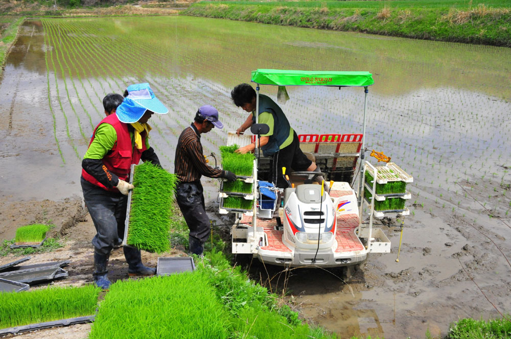 - 30일 팔덕면 월곡리 여운기(44)씨의 논(2ha)에서 올해 첫 모내기가 실시됐다. 여씨는 동진찰벼로 농협육묘장에서 키워 이날 모내기를 하고 오는 8월말경 수확할 예정이다. -2012. 4. 30-