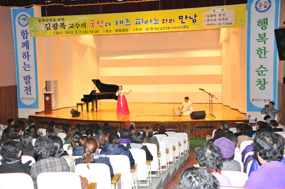 - 지난해 풍산농공단지에 둥지를 튼 한국C&T 순창방적공장이 주관한 지역주민과 함께하는 문화공연이 7일 군민향토회관에서 열렸다. 이날 문화공연은 지역주민과 80명의 직원 등 200여명이 참석한 가운데 전남대학교 김광복 교수의 ‘한국음악의 이해’라는 주제의 강의에 이어 판소리 이지선, 김광복 교수의 피리, J.C Clark의 피아노 연주로 관객들의 뜨거운 박수갈채를 받았다. -2012. 3. 8-