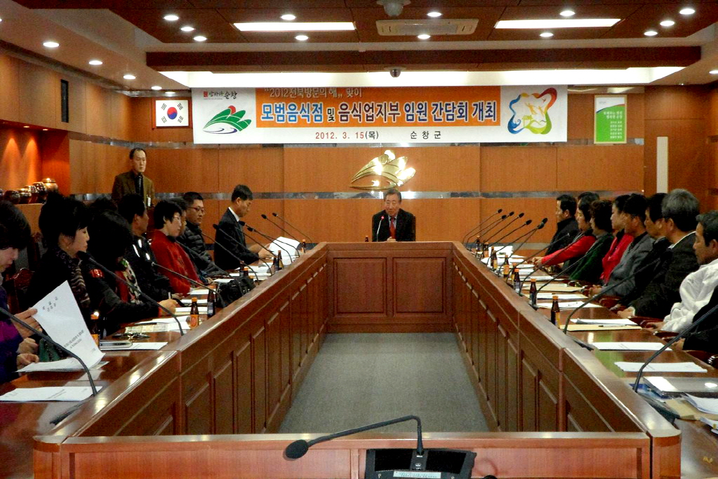 - 순창군이 관광객 유치와 순창 전통장류 홍보에 앞장서기 위해 모범음식점 및 음식업지부 임원과의 간담회를 실시했다. 15일 군청 영상회의실에서 가진 간담회는 김경선 부군수 주재로 모범음식점, 음식업지부 임원 등 22명이 참석한 가운데 음식문화 관련 개선사항 등에 대한 전반적인 논의가 이뤄졌다. -2012. 3. 15-