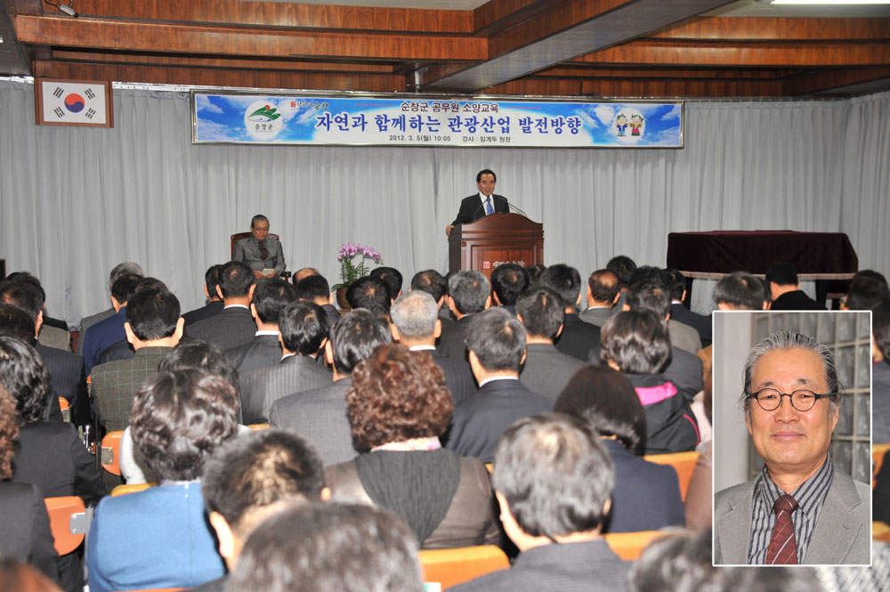 - 자연과 함께하는 순창군 관광산업 발전방향이라는 주제로 5일 군청 회의실에서 200여명의 공무원을 대상으로 기도 안성시 보개면 너리굴문화마을 임계두(58) 원장의 특강이 있었다. 임원장은 ‘순창군의 전 마을이 리조트가 되고, 향토음식점을 만들어 시골의 향수에 목마른 도시민들의 유치에 전력을 기울여야 합니다. 관광객이 와서 놀고 즐길 수 있는 자연친화적인 여건을 만들어야 합니다’라고 말하며 ‘이제는 국내를 넘어 세계속의 마을로 자리잡아야 한다. 순창의 자연마을을 지구상에서 가장 좋은 마을로 만들어야 하고, 순창의 고추장을 전세계에서 가장 맛있는 고추장으로 만들어내야 무한한 경쟁력을 갖추게 된다’고 강조했다. 또 ‘순창군에서 시범마을을 만들어 집집마다 방 두개씩을 비워 마을 전체를 리조트화하고, 집마다 각색있는 음식으로 향토음식점을 만들면 많은 관광객이 급증하게 될 것이며, 이를 행정에서 기획, 관리하면 순창군의 관광 레벨이 한층 높아질 것’이라고 조언했다. -2012. 3. 5-