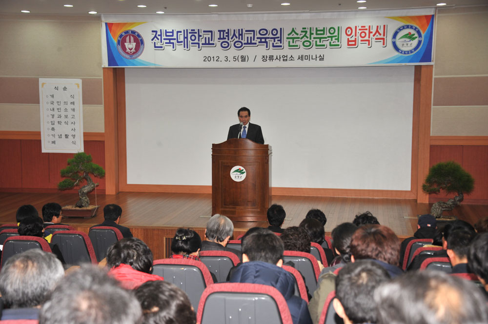 - 장류전문인력 양성과 배움의 기회를 놓친 지역주민들에게 학사학위 취득 기회를 제공하는 전북대 평생교육원 순창분원 신입생 입학식이 5일 장류사업소 세미나실에서 열렸다. 이날 황숙주 군수를 비롯 전북대 고영호 평생교육원장, 김영수 순창분원장, 신입생, 재학생, 가족 등 100여명이 참석했다. 입학식에 참석한 신입생 20명은 앞으로 4년동안 고추장민속마을에 위치한 순창분원에서 매주 월요일~목요일 밤 4시간씩 전북대학교 및 전북대 평생교육원 출강교수로부터 수업을 받게 된다. -2012. 3. 5-
