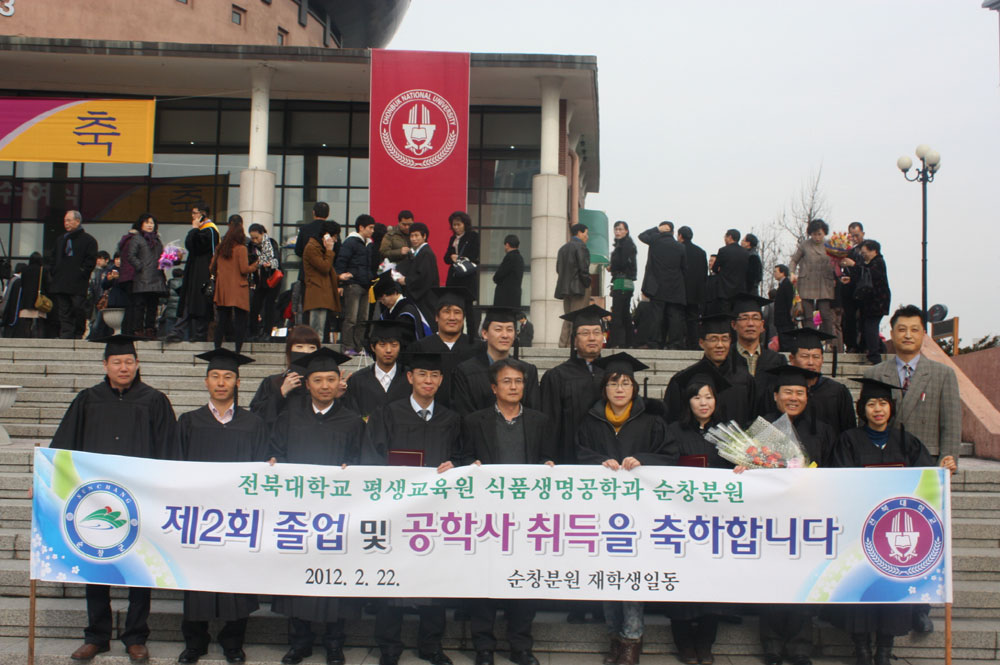 - 전북대학교 평생교육원 순창분원에서 학점은행제를 통해 식품공학 전공 학사학위과정을 이수한 28명이 주경야독으로 4년간의 학사학위과정을 마치고, 22일 전북대학교 학위수여식에서 영광스런 학사학위를 취득했다. 이들은 지난 4년간 전북대학교 평생교육원 순창분원에서 학점은행제를 통해 식품공학 전공 학사학위과정을 이수한 만학도 들로서 140학점을 취득하고 식품공학 전공으로 전북대학교 총장 명의의 공학사 학위를 수여받게 됐다. -2012. 2. 22-
