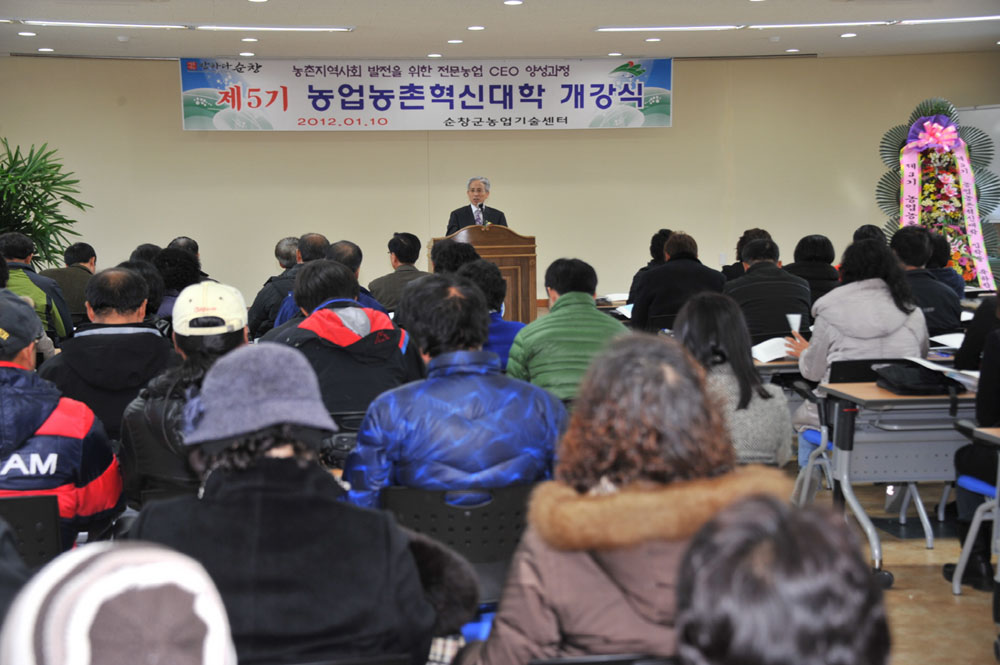 - 순창군농업기술센터(소장 채수정)는 급변하는 농업여건에 대처하고 지역농업발전을 선도적으로 이끌어갈 최고 수준의 전문농업 CEO를 양성하기위한 순창군농업농촌 혁신대학개강식이 10일 농업기술센터에서 있었다. 이날 입학생 50명과 가족, 졸업생 등 100여명이 참석한 가운데 입학식을 시작으로 오는 12월 18일까지 농한기를 활용한 30회의 강의와 5회의 국내 선진농업 현장견학, 해외선진농업 벤치마킹 등 35회에 걸쳐 진행되며, 친환경농업, 농산물가공, 농산물마케팅, 농촌개발, 농촌체험관광, 리더십 등 다양한 프로그램으로 운영된다. -2012. 1. 10-