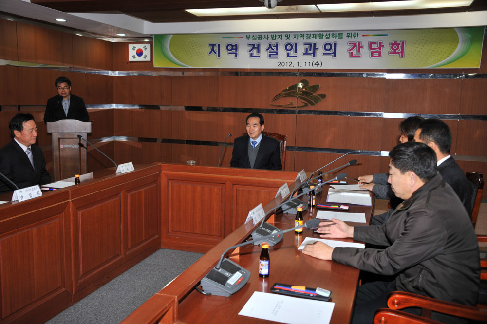 - 순창군이 부실공사를 방지하고 지역 건설경기를 활성화하기 위해 관내 건설업체 대표 10여명과 11일 군 영상회의실에서 간담회를 갖고 지역경제 활성화 대책, 공사의 공정성 및 투명성 확보 방안 등에 대해 논의했다. -2012. 1. 11-