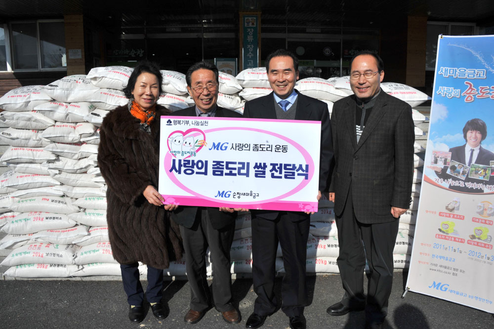 - 순창새마을금고(이사장 이성봉)는 11일 설을 맞아 홀로 사는 어르신, 기초 수급자 세대 등 어려운 이웃에게 전달해 달라며 쌀 20kg 200포(800만원 상당)를 황숙주 순창군수에게 전달했다. 이는 지난해 10월 순창군과 새마을금고간 MOU를 체결했던 지역희망공헌사업의 일환으로 추진된 것이다. -2012. 1. 11-