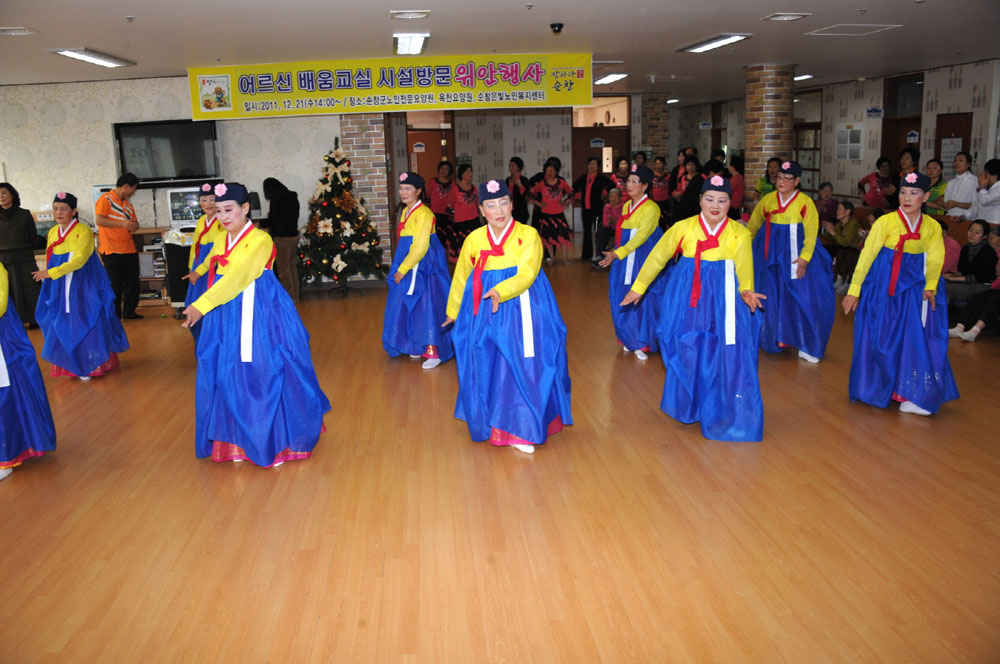 - 배움교실 회원들은 21일 순창군노인전문요양원과 옥천요양원, 순창은빛노인복지센터 등 3개소의 시설을 방문해 공연을 펼치며 올 한 해 동안 사회교육 프로그램 운영을 통해 갈고 닦았던 실력을 발휘했다. 지난 3월부터 실시한 어르신 배움교실은 총 9개 과목에 280여명이 참여한 가운데 12월까지 실시되고 있으며, 이날 위문공연에는 장수춤, 노래교실, 댄스스포츠 등 3개 과목 100여명이 참여해 합창, 독창 등 노래공연과 장수춤, 스포츠댄스 등을 선보였다. -2011. 12. 21-