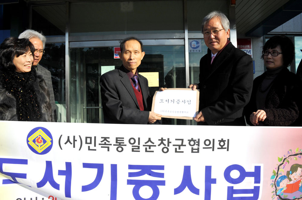 - (사)민족통일 순창군협의회(회장 김종국)는 22일 순창교육지원청 공공도서관을 방문해 도서 100여권을 전달했다. 민족통일 순창군협의회는 군민의식개혁사업의 일환으로 3년 동안 500여건의 통일안보에 관한 도서와 청소년을 위한 도서를 구입하여 전달하고 있다. -2011. 12. 22-