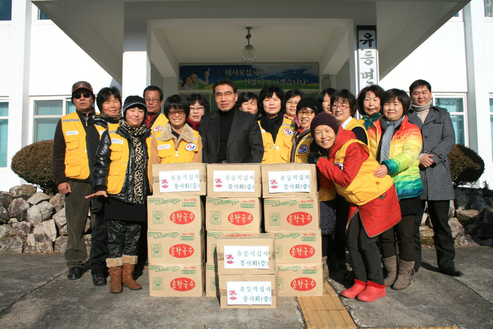 - 유등면 적십자봉사회(대표 서옥이)는 22일 관내 14개 마을회관과 경로당에 국수 14박스(60만원 상당)를 전달해 따뜻한 온정을 전했다. 유등면 적십자봉사회는 2010년에 결성돼 매월 독거노인 주거환경개선, 밑반찬 봉사, 이·미용 봉사 등을 실천하고 있으며, 유등면민의 복지개선과 지역발전을 위하는 일에 앞장서는 등 지역사회에 귀감이 되고 있다. -2011. 12. 22-
