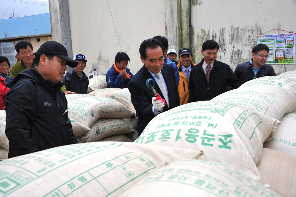 - 순창군은 8일 적성 관평 창고에서 농산물검사소, 농협 직원과 주민 등 100여명이 수매장에 참여한 가운데 2011년산 공공비축용 벼 매입을 위한 첫 공판을 시작했다. 올해 매입물량은 산물벼 1만5천가마, 포대벼 85,656가마 등 총 100,656포대(조곡 40kg)이며, 품종은 온누리와 황금누리 2개 품종으로 8일부터 29일까지 19개소에서 28회에 걸쳐 실시할 예정이다. -2011. 11. 9-