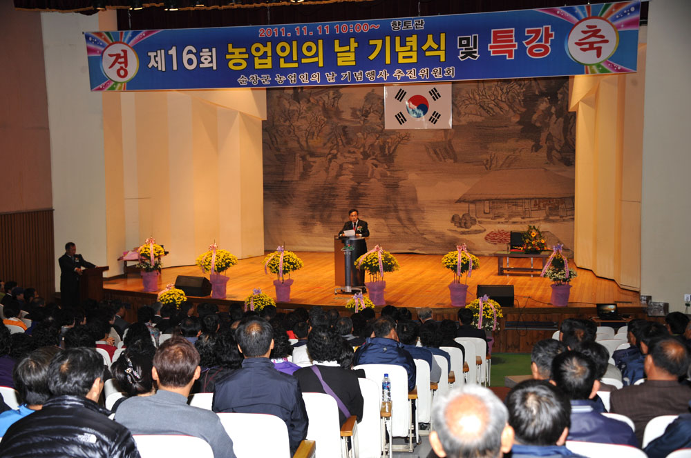 - 농업인의 날을 맞은 11일 복지회관 향토관에서 황숙주 군수, 공수현 군의회의장을 비롯한 농업인 600여명이 참석한 가운데 기념식과 특강, 화합의 한마당 잔치가 열렸다. 이날 인계면 황병하씨가 신지식인 상을 비롯해 친환경분야 구림면 김종원씨, 농업교육분야 팔덕면 강병준씨, 우수마을 분야에 구림면 설성환씨가 각각 선정되어 영광의 시상식을 가졌다. -2011. 11. 11-