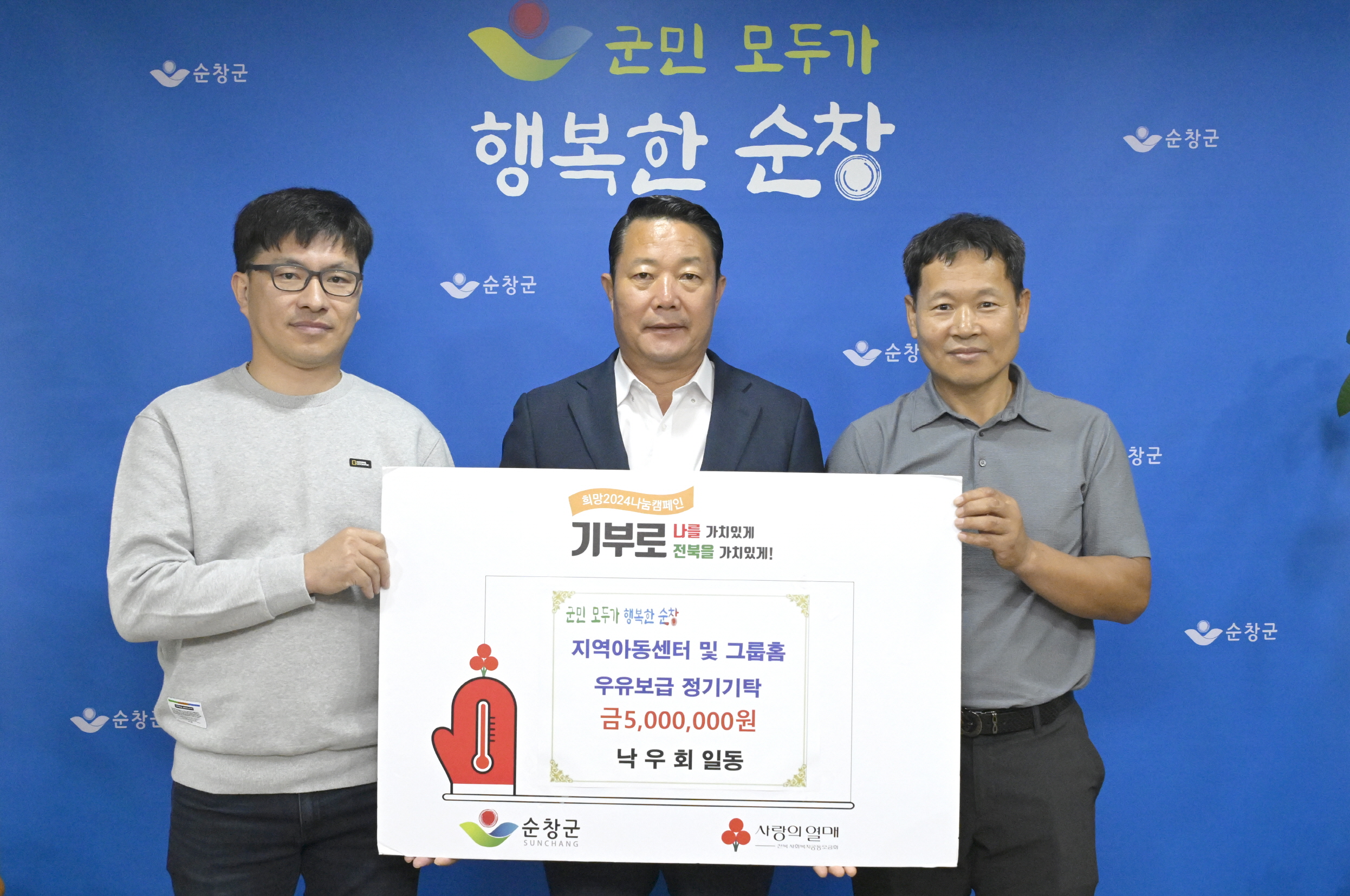 - 순창군 낙우회(회장 정만균)가 10일 지역 아동들의 건강한 성장을 위해 따뜻한 마음을 전했다. 이날 낙우회는 500만원 상당의 우유를 지역 아동들에게 후원하기로 했으며, 이는 지역 낙농가들이 오랫동안 지역사회로부터 받은 관심과 사랑에 보답하고자 하는 마음에서 마련됐다. 정만균 회장은“낙농업계도 어려움을 겪고 있지만, 지역의 미래인 아이들을 위해 회원들이 한마음으로 뜻을 모았다”며“앞으로도 지역의 소외된 이웃들을 위한 나눔 활동을 지속적으로 이어 나가겠다”고 밝혔다. 최영일 순창군수는“경제적으로 어려운 시기임에도 불구하고, 아이들의 건강을 위해 매년 후원을 이어가는 낙우회의 노고에 깊은 감사를 드린다”면서 “기탁해 주신 물품은 꼭 필요한 곳에 빠짐없이 전달하겠다”고 화답했다.