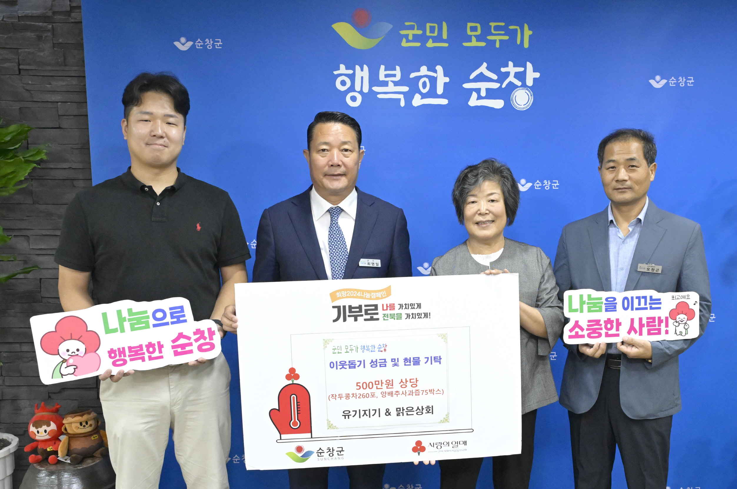 - 순창군 쌍치면의 식품제조기업‘유기지기․맑은상회F앤B’(공동대표 심은숙, 김지항)가 지역 저소득 가정을 위해 따뜻한 나눔을 실천했다. 26일 유기지기․맑은상회F앤B은 400만원 상당의 작두콩차 250포, 양배추사과즙 75박스와 현금 100만원을 더해 지역 저소득 가정에 실질적인 도움을 전했다. 모자 경영인인 심은숙, 김지항 대표는 쌍치면에서 식품제조업체를 운영하고 있으며, 주로 쿠팡과 같은 온라인 플랫폼을 통해 판매망을 넓혀가고 있다. 심은숙 대표는“지역 주민들의 성원으로 성장할 수 있었던 만큼, 이제는 저소득 가정들에게 힘이 되고자 한다”면서“건강에 좋은 제품과 함께 의미있는 도움을 드릴 수 있어 기쁘다”고 기부 취지를 밝혔다. 최영일 순창군수는“어려운 시기에 지역 주민들을 위해 뜻깊은 나눔을 실천해 주신 유기지기․맑은상회의 심은숙, 김지항 대표님께 진심으로 감사드린다”면서“기부자의 따뜻한 마음이 그대로 전해질 수 있도록 꼭 필요한 분들께 잘 전달하겠다”고 전했다.