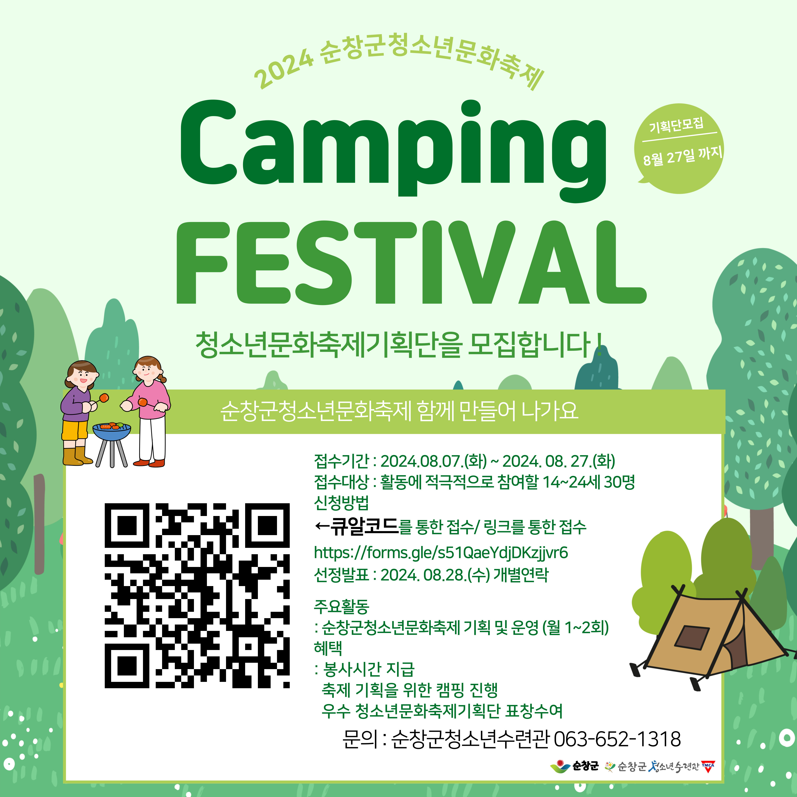 - 순창군청소년수련관(관장 이상은)이 순창군청소년문화축제의 주역이 될 청소년 문화축제 기획단을 모집한다고 13일 밝혔다. 축제기획단은 청소년문화축제의 기획과 홍보를 통해 축제 전반에 걸쳐 청소년들이 즐길 수 있는 행사를 주도적으로 만들어 나가고, 행사 운영의 주체로서 핵심적인 역할을 맡게된다. 지원 자격은 순창군에 거주하거나 관내 학교에 재학 중인 14세부터 24세까지의 청소년이다. 수련관은 총 30명을 선발해 오는 10월까지 축제의 밑그림을 그려나갈 예정이다. 선발된 단원은 축제에 대한 아이디어를 발굴하고, 세부 프로그램을 기획·운영 하며 축제를 홍보하는 등의 활동을 한다. 아울러, 공식 위촉장 수여와 함께 자원봉사 활동 시간이 인정되며, 특히 뛰어난 활약을 보인 단원들에게는 표창의 영예가 돌아간다. 이번 기회에 동참하고 싶은 청소년들은 공식 포스터에 게재된 QR코드나 온라인 링크(https://forms.gle/F1zHToPyow3pEzcF7)를 통해 지원할 수 있으며, 최종 선발된 청소년들은 오리엔테이션을 시작으로 본격적인 활동에 돌입하게 된다.