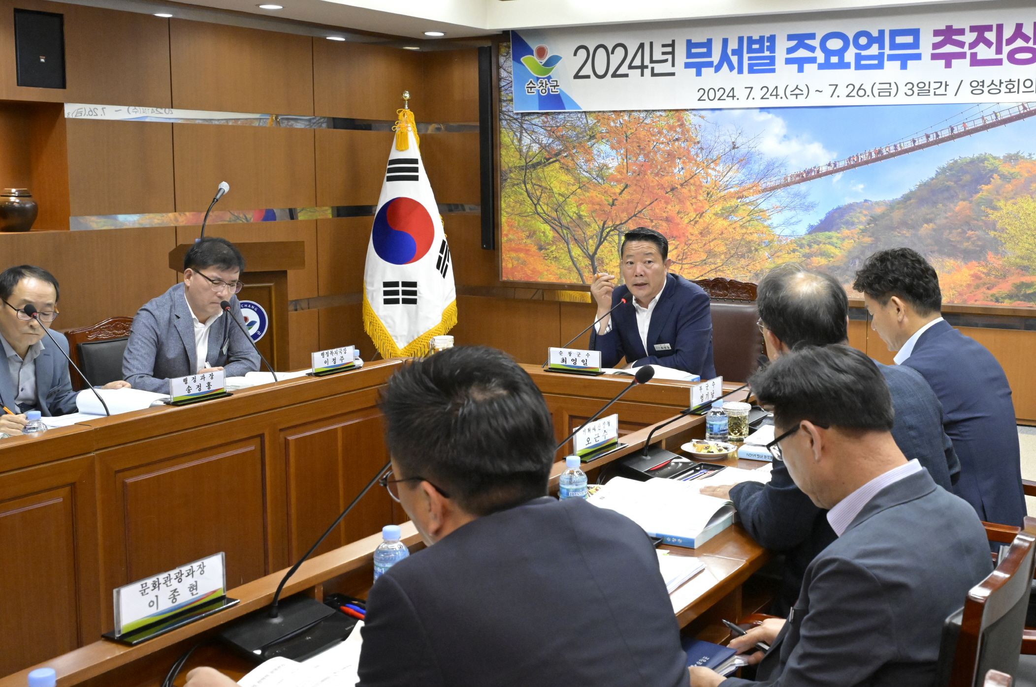 - 순창군이 지난 24일, 군청 2층 영상회의실에서 '2024년 하반기 주요업무 추진상황 보고회'를 개최하며 민선 8기 후반기의 새로운 도약을 알렸다. 오는 26일까지 3일간 개최되는 이번 보고회는 민선 8기 후반기의 시작점에서 군정 방향을 재정립하고 핵심 사업의 추진 상황을 점검하기 위해 마련됐다. 최영일 군수 주재로 진행된 이번 보고회에는 부군수, 실·국장, 각 부서장, 팀장들이 참석한 가운데 진행됐으며, 첫날 해당 부서인 기획예산실, 행정과는 2024년 주요 사업의 추진 상황과 성과를 공유하고, 순창군의 주요 현안과 역점사업에 대한 문제점 점검과 해결 방안 모색에 집중했다. 이날 보고된 상반기 주요 성과로는 민선 8기 공약 실천·이행평가 최우수(SA) 달성, 626억 원의 국가예산 확보, 쉴랜드 문화체육관광부 웰니스관광지와 전북 치유관광지 10선 선정, 농촌유학생 41명 모집이 포함됐다. 특히, 청년 농촌보금자리 조성사업 공모 선정, 청년 종자통장 지원 사업 확대, 공공형 외국인 근로자 30명(라오스) 도입 운영, 지방상수도 현대화 사업 최우수 성과 달성(유수율 98.8%) 등은 순창군의 선제적이고 실용적인 정책 추진의 대표적 사례로 꼽혔다. 아울러, 하반기 계획으로 ▲전원마을 500호 본격 조성 ▲경천․양지천 수변종합개발사업 ▲농촌유학 체류형 거주시설 조성사업 ▲보훈회관 건립 ▲공설 추모공원 조성 ▲쉴랜드 워케이션 거점공간 조성사업 ▲강천산 온자실 치유관광지 조성 ▲ 제61회 전북특별자치도민체전 성공적 개최 등 다양한 군 핵심사업과 공약, 중장기 전략사업들이 제시됐다. 이를 통해 군은‘군민화합, 지역경제 활성화, 돈버는 농업, 따뜻한 복지, 정주인구 증대’라는 5대 군정목표 실현에 박차를 가할 예정이다. 최영일 순창군수는“순창군 공직자들이 맡은 바 분야에서 열심히 노력한 덕분에 민선 8기 주요 시책들이 가시적인 성과를 나타내며 지역민들의 삶이 점차 달라지고 있다”면서“앞으로도 계획했던 사업들이 속도감 있게 추진 될 수 있도록 사업 추진 상황 등을 세심하게 살펴 군민이 체감하는 성과로 이어질 수 있도록 모든 역량을 집중해 달라”고 당부했다.