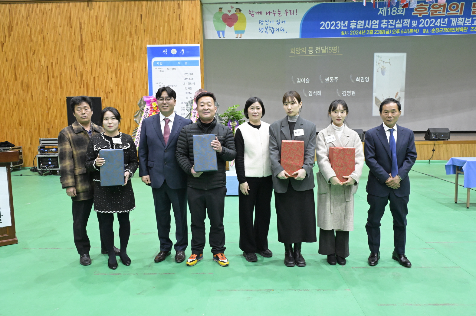 - 순창지역자활센터 후원회(회장 임주섭)가 지난 23일 순창군장애인체육회관에서 제18회 후원의 날 행사를 개최했다. 이날 행사에는 최영일 순창군수와 순창군의회 신정이 의장, 후원자와 운영위원 등 200여명이 참석한 가운데 성공적으로 개최됐다. 식전공연을 시작으로 후원회장 이취임식, 축사, 후원위원회 활동보고 순 등으로 행사는 진행됐으며, 이번에 새롭게 취임된 임주섭 회장은 “어깨가 무겁지만 후원자 발굴 및 후원회를 더욱 활성화하여 어두운 곳에서 힘들어하는 이웃들을 위해 조금이나마 도움이 될 수 있도록 노력하겠다”고 밝혔다 아울러, 후원의 날 행사에는 매년 후원에 적극 동참한 후원자에게 희망의 등불을 전달하여 감사와 노고를 격려하는데 이번 행사에서는 임석래 후원자외 4명의 후원자에게 희망의 등불이 전달되어 참석자로부터 박수갈채를 받았다. 한편 후원회는 지난해 후원활동을 적극적으로 펼쳐 결식 어르신 등을 위한 도시락 지원, 주거환경개선사업, 장학금 지원사업, 어르신 나들이 행사 등에 4천 6백여만원을 저소득층에게 지원한 바 있다.