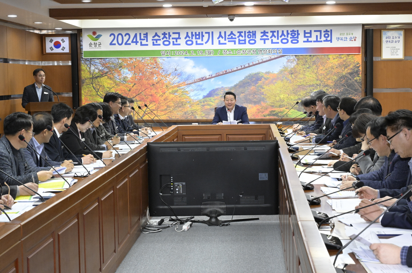 - 순창군은 지난 19일 고물가·고금리 여파로 위축된 지역경제 활성화를 위해 최영일 군수 주재하에 전 부서장이 참석한 ‘2024년도 상반기 신속집행 추진상황 보고회’를 가졌다고 밝혔다. 군은 이번 보고회를 통해 신속집행 대상액 3,567억 원 중 58.9%에 해당하는 2,101억 원을 상반기 목표액으로 자체 설정하고, 부서별 주요 사업 추진계획을 공유하는 한편, 사업별 문제점 파악과 전략적 해결방안 등에 대해 논의했다. 이날 최 군수는 지역경제에 파급효과가 큰 대규모 사업과 시설사업, 기본계획 및 실시설계 용역사업 등에 대해 집중 점검하면서 특별관리 방안을 마련할 것과, 올해 발주하는 공사·용역은 조기 계약 추진을 통해 선급금과 기성금 등을 최대한 집행할 것을 지시했다. 뿐만 아니라, 최 군수는 절차 지연으로 집행이 부진한 사례가 발생하지 않도록 인·허가, 보상 협의 등 사전 행정절차도 신속하게 이행하고, 현안사업과 공약사업 또한 적극 추진될 수 있도록 관리를 강화해 줄 것을 강조했다. 이와 함께, 군은 속도감 있는 재정집행을 위해 행안부 신속집행제도 활용지침에 따라 긴급입찰, 선급금 집행 활성화, 계약심사 기간 단축, 관급자재 선고지 제도 등 관련 제도를 활용해 재정집행 목표를 달성할 수 있도록 최선을 다할 방침이라고 전했다. 이를 위해 군은 부군수를 단장으로 하는 신속집행 추진단을 구성, 주기적으로 추진상황을 점검해 부진사업을 집중 관리하는 등 지속 관리할 계획이다. 최영일 군수는“지역경제 활성화와 민생경제 회복이라는 선순환 고리가 이어지기 위해서는 재정 신속집행이 무엇보다 중요하다”며“재정집행의 혜택이 군민과 지역경제에 신속하게 전해질 수 있도록 최선을 다해줄 것”을 당부했다.