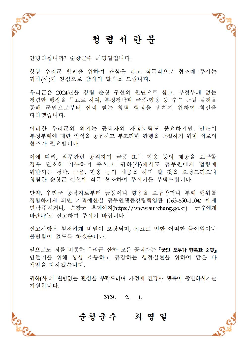 - 순창군은 2일 청렴한 순창 실현·확산을 위해 관내 214개 기업 및 민원인과 공직자들을 대상으로 청렴 서한문을 발송했다고 밝혔다. 이번 서한문은 군의 청렴 다짐과 실천 의지를 보여주고 군민들로부터 신뢰받는 행정을 펼치기 위해 추진됐다. 발송된 청렴 서한문은 군에서 업무 처리한 공사·용역·물품계약, 보조금지원, 재·세정 및 인허가 등 직무 관련자를 대상으로 부정·부패에 대한 인식을 공유하고, 법령에 위배 되는 청탁, 금품·향응에 대한 요구와 제공을 근절하자는 내용을 담고 있다. 최영일 순창군수는“이번 청렴 서한문 발송은 우리 군의 확고한 청렴의지를 군민들에게 전달하는 계기가 될 것”이라며“임기 동안 부패는 멀리하고 청렴과 가까이함으로써 청렴의 뜻을 항상 가슴에 새겨 군민 여러분께 신뢰받는 청렴 순창 구현을 위해 공정하고 투명한 군정 업무 추진에 최선을 다하겠다”고 밝혔다.