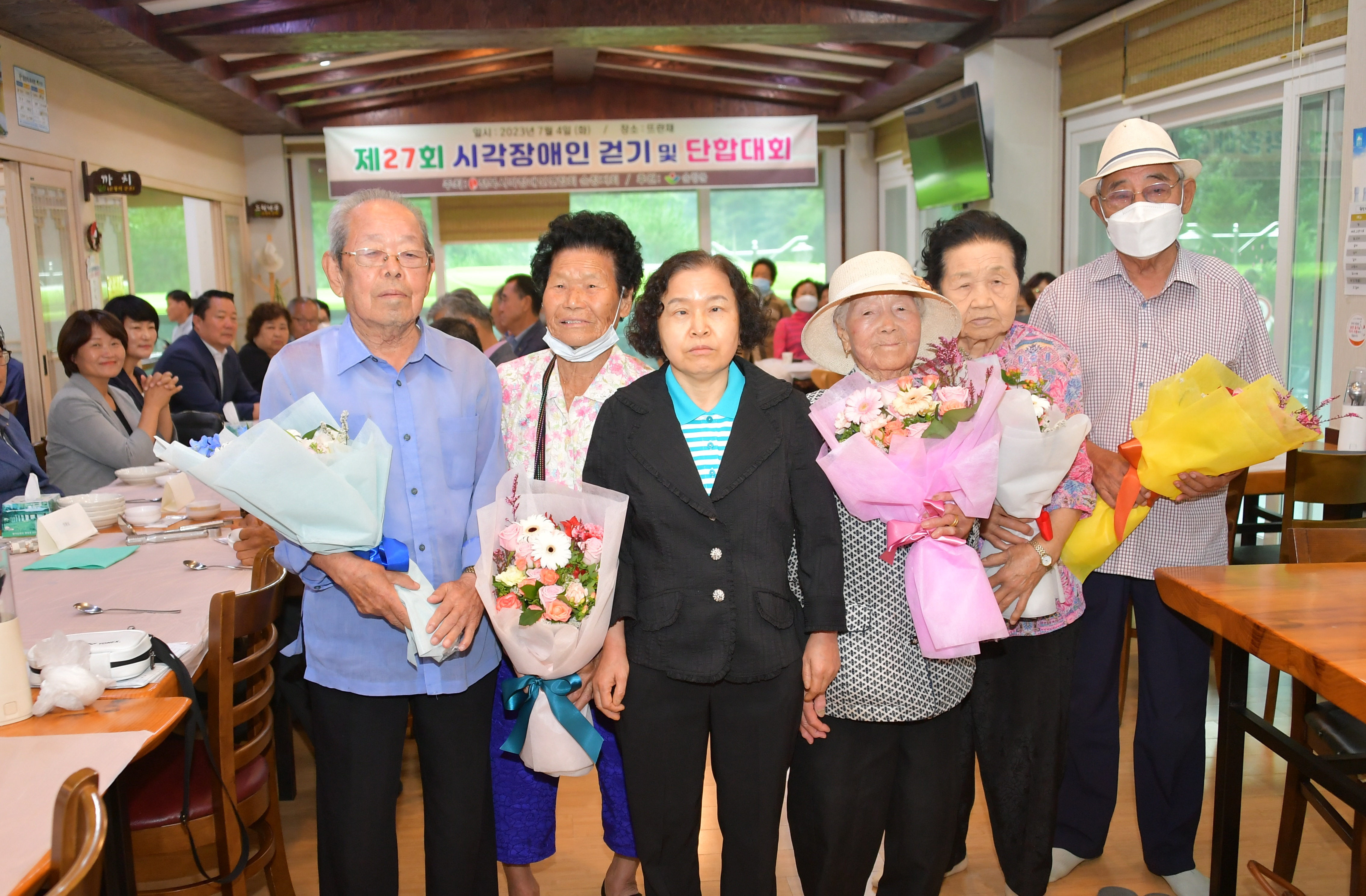- (사)전북시각장애인연합회 순창지회(회장 옹은순)는 4일 팔덕면 뜨란채 일원에서 시각장애인들을 위한 오감만족 걷기 및 단합대회를 개최했다. 이번 걷기 및 단합대회는 올해로 27회를 맞았으며, 최영일 순창군수를 비롯한 내외빈과 시각장애인연합회원 및 자원봉사자 등 약 100명이 참석해 시각장애인들의 소외된 마음을 이해하는 뜻깊은 시간을 보냈다. 특히, 구순이 넘은 나이에도 불구하고 활발한 활동을 전개하고 있는 박종채(91세), 이준의(90세), 이명순(93세), 오소윤(90세), 이진기(90세) 등 5명의 회원에게 장수상 표창패를 전달했다. 옹은순 시각장애인 순창지회 회장은“이번 프로그램을 통해 우리 회원들의 친목 도모는 물론 따뜻한 정을 나누는 뜻깊은 시간이 됐길 바란다”며“앞으로도 시각장애인연합회 순창지회는 다양한 사업을 통해 회원들의 신체적, 정신적 지원을 아끼지 않겠다”고 말했다. 한편, (사)전북시각장애인연합회 순창지회는 소리문화탐방, 심청이상 시상 및 가족 한마당, 가을 낙엽밟기 등 다양한 행사를 추진하여 회원들이 신체적 건강 증진 도모 및 정서적 지지를 지원하고 있다.