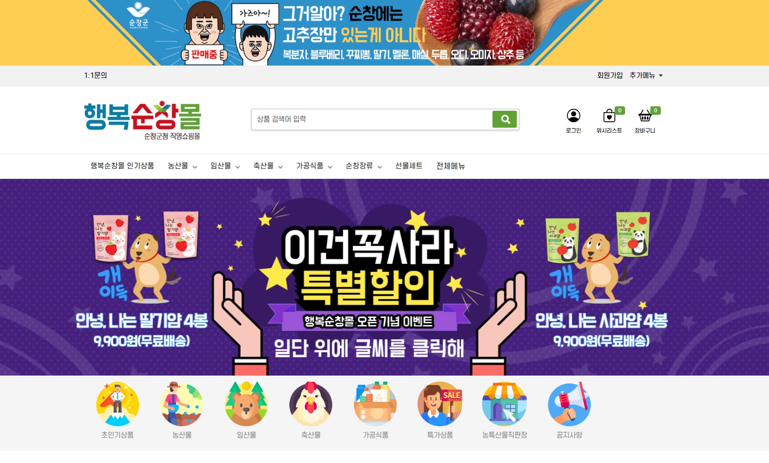 - 순창군이 7일 금요일 아홉시 농특산물 온라인 쇼핑몰‘행복순창몰’을 오픈하고 오픈기념 특별이벤트를 실시한다. ‘행복순창몰’은 순창에서 생산되는 우수농특산물 홍보와 농가별 전자상거래 운영에 따른 경영부담을 낮추고자 개설됐으며, 군에서 직접 관리하고 운영을 지원함으로써 안정적인 판로확보와 농가소득 향상에 기여할 예정이다. 군은 지난 6월 쇼핑몰 입점업체를 모집한 결과, 관내 농가, 생산자 단체, 업체 등 47개 농가가 최종 선정되었으며, 블루베리, 쌈채소, 소고기 등 총 200여개의 제품이 판매된다. 또한, 군은 새로운 시장 환경에 대응하기 위해 PC와 스마트폰의 맞춤 환경을 제공하는 반응형 웹을 구축했으며, 이를 통해 소비자들은 언제 어디서나 스마트폰을 통해 손쉽게 상품을 구매할 수 있도록 했다. 특히‘행복순창몰’오픈 이벤트로 블루베리 1kg(9,900원) 무료배송 행사가 진행되며 구매를 완료한 회원에 한해 쇼핑몰에서 다른 상품을 구매할 수 있는 적립금 5,000원을 지급한다. 최영일 순창군수는“농산물 유통 및 소비자들의 농식품 소비 트렌드가 온라인 플랫폼 중심으로 급변하고 있어, 이에 순창군 농업인들도 발 빠르게 대응할 필요가 있다”며“앞으로 구매 트렌드 변화에 대응한 소비자 만족도 제고뿐만 아니라 생산자도 손쉽게 입점해 행복순창몰이 활성화될 수 있도록 이용자 편의성 개선에 지원을 아끼지 않겠다”고 말했다. 쇼핑몰 문의 사항은 순창군 농산물유통팀(063-650-5182)로 문의하면 된다.