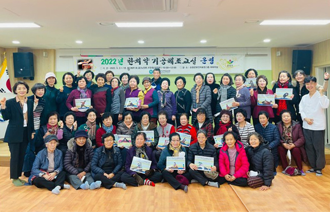 - 순창군보건의료원은 2022년 한의약건강증진사업 중 맞춤형 프로그램 한의약 기공체조교실을 성황리에 마무리하고 수료식을 지난 20일 순창군 보건의료원 3층 대회의실에서 진행했다. 수료식에 참여한 대상자들은 지금까지 익혀온 동작 자세를 취하고 사진으로 남기면서 훈훈한 마무리를 지었다. 한의약기공체조교실은 65세이상 노인반 화요일 25명 금요일 25명, 성인반 대상자 20명 총 70명으로 5월 3일부터 12월 16일까지 90회 운영했다. 전문적인 강사의 지도로 기혈순환체조, 심신안정과 단전호흡, 명상법, 등을 진행해 지치고 움츠렸던 군민들에게 활기를 불어넣었다. 의료원이 진행한 프로그램 사전 · 사후 조사 결과 신체통증과 건강수준이 향상되었으며, 출석율 80%, 만족도는 100%를 기록했다. 서울에서 이사 온 후 정착하기 힘들었던 팔덕면의 한 주민은 “프로그램참여 이후 정신적으로 건강해지고, 병원 가는 횟수도 현저히 줄었다”면서 “보건사업에 힘써주신 관계자에게 감사하다” 는 인사말을 전했다. 조석범 순창군보건의료원장은 “2023년도에도 기공체조교실을 비롯해 한의약 관련 사업분야를 보완하고 어르신 모두가 건강하고 행복할 수 있도록 노력하겠다”고 밝혔다. 한의약 기공체조교실에 대한 자세한 사항은 보건사업과 건강증진계(063-650-5236) 문의하면 된다.