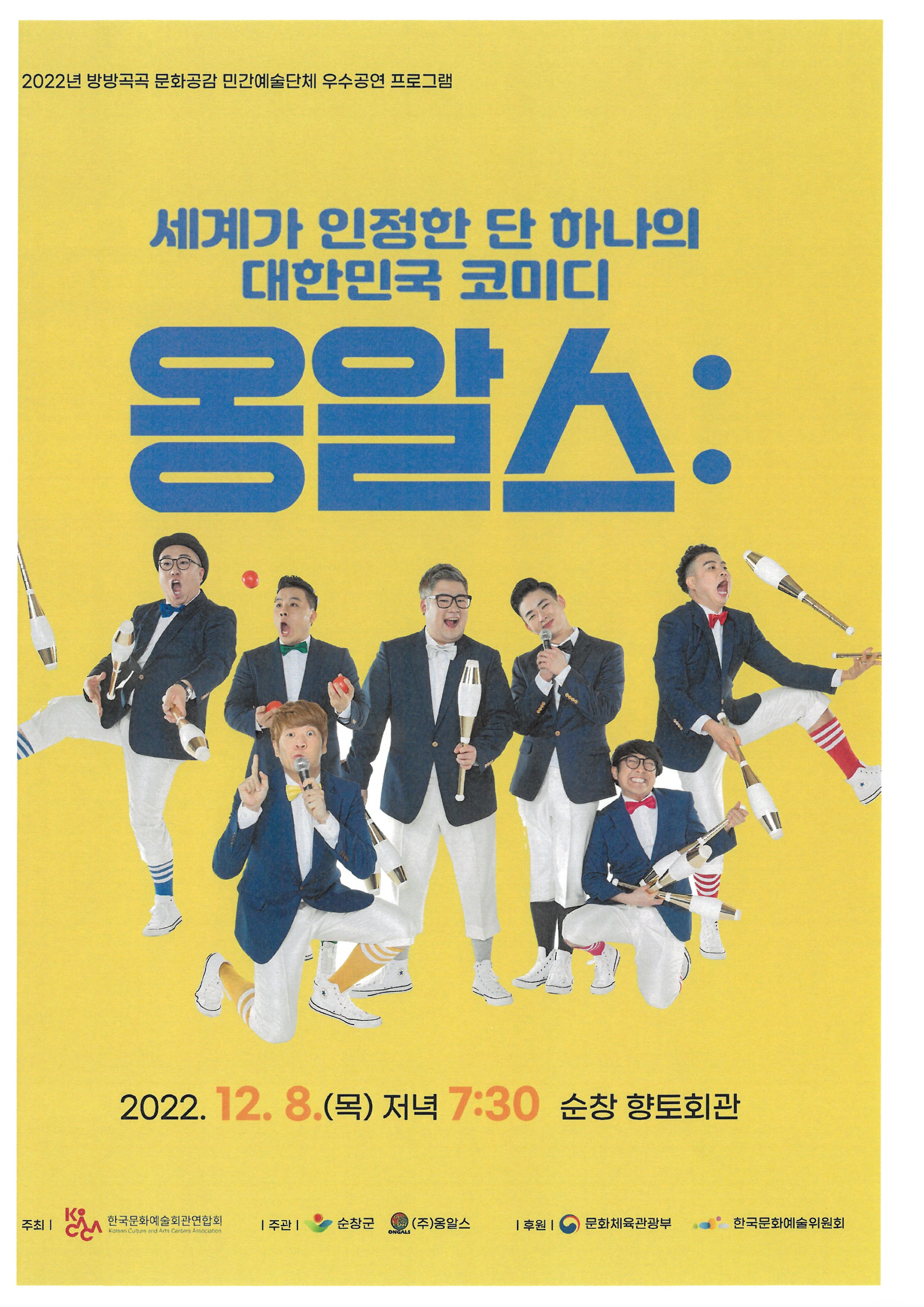 - 순창군이 오는 8일 오후 7시 30분 향토회관에서 「2022년 문예회관과 함께하는 방방곡곡 문화공감 사업」의 민간예술단체 우수프로그램 중 하나인 옹알스 히스토리 쇼 ‘ONGALS HISTORY SHOW’ 공연을 진행한다. ‘옹알스’는 2007년에 결성된 퍼포디언팀으로 세계 각국에서 다양한 비언어 장치를 통해 언어와 국경을 뛰어넘은 웃음으로 세계인의 마음을 사로잡고 있으며, 넌버벌(nonverbal) 공연의 새로운 이정표를 세우고 있다. 옹알스 히스토리 쇼 ‘ONGALS HISTORY SHOW’는 옹알스의 새로운 기획공연으로 멤버들이 각자 가지고 있는 특기와 장기를 공연에 녹여 화려하고 코믹하게 표현하고 여기에 마술과 마임, 저글링, 비트박스 등 다양한 볼거리를 추가하여 구성했다. 이번 공연의 관람료는 무료이며 공연시간은 80분이다. 관람객 입장은 선착순으로 진행되고 마스크를 미착용하거나 코로나19 의심 유증상자는 입장이 불가하다. 공연 관람에 대한 자세한 사항은 문화관광과 문화예술계(063-650-1635)로 문의하면 된다.