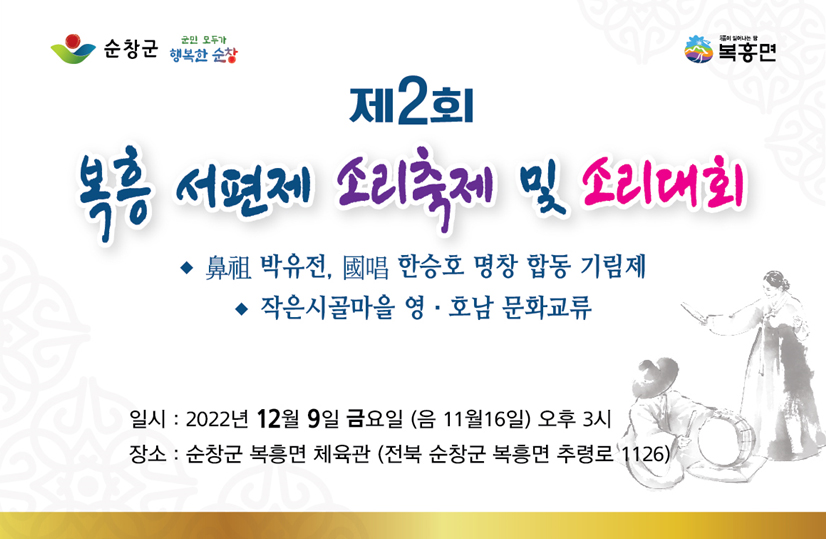 - 판소리 서편제의 창시자 박유전 명창의 고향 복흥에서 제2회 복흥 서편제 소리축제 및 소리대회가 오는 12월 9일 순창 복흥면체육관에서 개최된다. 이번 축제는 박유전 명창의 고향이 순창군 복흥이라는 자긍심을 고취하여 알리고, 지역 주민들이 공연을 직접 관람하고 대회에 참여하여 판소리 문화를 향유할 수 있는 기회를 제공하기 위해 개최된다. 박유전은 김세종·장재백 등과 같이 순창에서 배출한 빼놓을 수 없는 명창이다. 그가 구축한 서편제가 동편제 소리와 함께 우리나라 판소리의 양대 산맥을 이루고 있는 점에서 박유전이 판소리사에서 차지하는 비중은 막중하다. 아울러 동편제와 서편제를 아우르는 소리 세계를 오늘날까지 전승하게 한 점도 그의 업적이다. 행사는 박유전, 이날치, 한승호로 이어진 정통 서편제의 계보를 알리는 기림제를 시작으로 이어 복흥과 담양, 함양 예술단체에서 판소리, 난타공연 등 예술 교류 행사와 함께 지역 주민이 참여하는 판소리 소리대회(나도명창)가 진행될 예정이다. 이번 행사를 주관한 박창흠 복흥면 주민자치위원장은 “서편제의 시조 박유전의 고향 복흥에서 전통과 문화를 지켜나가는 소리축제를 개최하게 된 것을 뜻깊게 생각한다”며 “행사에 많은 분들이 참여하여 우리의 전통문화를 즐기는 시간이 되었으면 한다”고 말했다. 한편, 판소리는 현대인들에게 독특한 발성법으로 관객을 울리는 정서적 기쁨과 감동으로 그 가치를 인정받아 유네스코 세계 문화유산에 지정된 우리의 소중한 문화유산으로 순창군 복흥면에서는 2021년부터 복흥 서편제 소리축제 및 소리대회와 주민자치 프로그램을 통해 판소리 교육을 진행해오고 있다.
