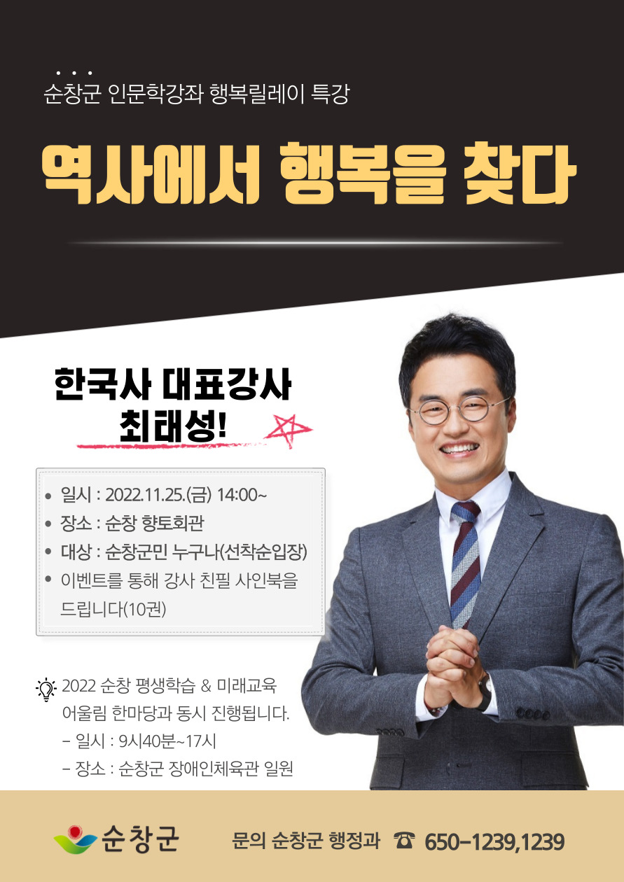 - 순창군이 오는 25일 오후 2시 향토회관에서 순창군민을 대상으로 ‘역사속에서 행복을 찾다’라는 주제로 인문학 강좌를 진행한다고 밝혔다. 이번 강좌는 순창군이 2022년 2월에 교육부로부터 주관하는 평생학습도시 선정을 기념하여 진행한 ‘행복릴레이 특강’ 3강 중 마지막 강좌로, 지난 9월에는 정덕희 강사의 ‘그럼에도 행복하소서’, 10월에는 윤대현 강사의 ‘20대의 건강한 뇌 유지하며 행복하게 사는 방법’이라는 주제로 진행한 바 있다. 최태성 강사는 EBS와 이투스에서 한국사 강의를 통해 학생들과 일반인들에게 큰별샘으로 널리 알려진 한국사 전문 강사로 현재 모두의 별별 한국사 연구소 소장과 국사편찬위원회 자문위원, EBS 역사교육 자문위원 등으로 활동했다. 저서로는 『큰별샘 최태성의 별별한국사』 외 다수가 있으며, 당일 최태성강사가 추첨을 통해서 본인의 저서 ‘역사의 쓸모’ 친필 싸인북을 증정할 계획이다. 조태봉 행정과장은 “이번 인문학강좌를 통해 순창군민들이 평생교육에 많은 관심을 가지는 계기가 되었으면 한다”며 “역사특강인 만큼 순창군의 숨겨진 역사적 인물들을 조명하는 시간도 가지는 시간이 되었으면 한다”고 밝혔다. 순창군 최태성 강사 초청 행복릴레이 특강에 관한 문의 사항은 행정과 인재평생교육계(063-650-1239)로 문의하면 된다.
