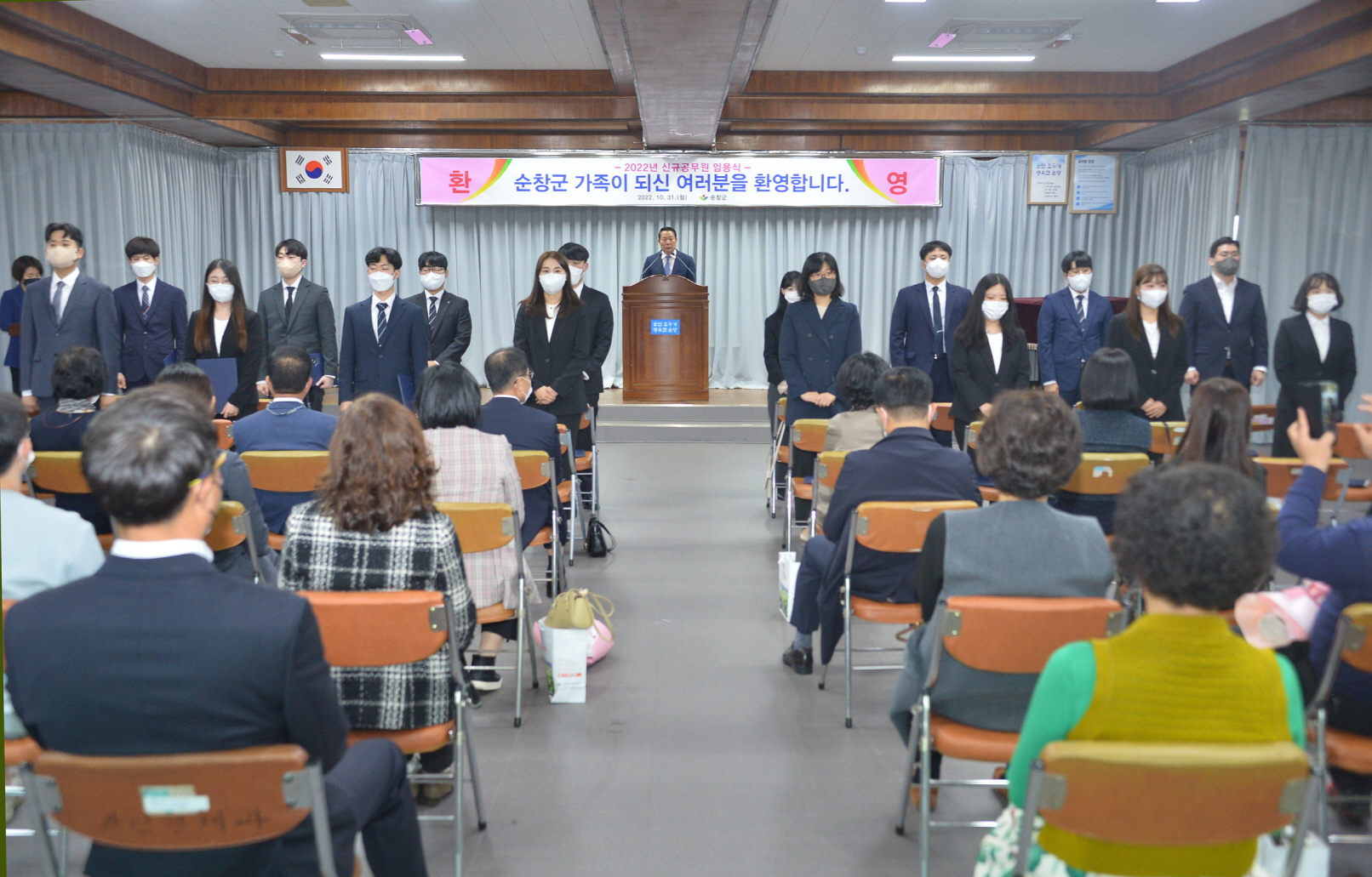 - 순창군은 10월 31일 순창군청 3층 회의실에서 새내기 공무원 16명과 가족들 25명이 참석한 가운데 공직사회의 첫발을 내딛는 임용식을 가졌다. 이번에 순창군으로 신규 임용된 공무원은 9급 7개 직렬, 16명(행정 4, 공업 1, 농업 2, 녹지 1, 보건 1, 환경 1, 시설 6)이다. 이날 임용식에서는 최영일 순창군수와 부군수ㆍ국ㆍ실ㆍ과장 등 간부공무원이 참석하여 소개하는 시간을 갖고, 임용장 교부 후 신규임용자 선서, 기념촬영 순으로 진행되었다. 특히 신규공무원들은 가족들 앞에서 공무원으로서 긍지와 자부심을 갖고 일할 것을 다짐하였으며, 가족들과 함께 공무원 임용을 축하하는 시간을 가졌다. 최영일 군수는 임용식에 참석하여 신규공무원들에게 임용장을 직접 교부하고 “공직사회 첫발을 내딛는 신규공무원들을 진심으로 환영하며, 훌륭한 인재를 키워주신 부모님들께 감사드린다”며 “신규공무원들은 군정목표를 숙지하여 군정 발전을 위해 노력하고, 공직자로서 책임감과 소명의식을 갖고 최선을 다해달라”고 당부했다.