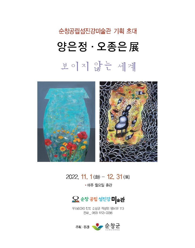- 순창군이 천혜의 자연환경을 갖춘 섬진강 장군목 일대를 예술적 감수성을 더한 새로운 공간으로의 도약의 발판으로 삼으며 섬진강 미술관에서 예술인마을 입주작가 초대전을 개최한다. 초대전은 ‘보이지 않는 세계’라는 제목으로 11월 1일부터 12월 31일까지 섬진강 미술관에서 열리며 양은정․오종은 작가의 서양화 작품 등 35점이 전시된다. 양은정 작가는 2020년 순창미술발전소 대표로 우리동네 공공미술 사업을 49명의 작가와 함께 완성했고 현재는 섬진강 예술인 마을 입주작가가 되어 마을사업과 디카시집 발간 등 섬진강 일대 스토리텔링 그림책 만들기 작업에 힘쓰고 있다. 이번 초대전에서 발효의 찬란한 신비로운 빛깔을 오방색의 화려함과 다양한 소재를 사용해 항아리로써 표현했다. 오종은 작가는 회화와 설치미술을 전문으로 하며 2019년 ‘지극히 사적이고 부질없는 것에 대하여’ 2018년 ‘Pray to Heaven’이라는 제목으로 개인전을 개최하였다. 2022년에는 터키 이스탄불에서 개최한 ‘한-터키 수교 65주년 기념미술교류전’과 프랑스 파리에서 개최된‘아트캐피털 살롱 꽁바레죵 2022’에 참여하였다. 한편, 군은 시골마을에 점차 젊은 청년들이 사라지고 성장동력이 약해지면서 외부의 젊고 생동감있는 작가를 수혈해 마을의 생기를 더하고 지역민이 문화예술에 좀 더 친숙히 다가갈 수 있는 분위기를 만들고자 지난해 예술인 마을을 조성했다. 예술인 마을에는 현재 6명의 작가가 입주해 예술활동에 전념하고 있다. 특히 섬진강 예술인 마을은 앞쪽으로 섬진강이 흐르고 1.5km에 걸쳐 기암괴석이 놓여있는 자연환경을 갖춘 터라 작가들이 작품활동을 하는 데 많은 영감을 주고 있다. 또한, 초대전이 열리는 섬진강 미술관은 군이 사업비 14억을 투자하여 적성면 평남리 483-1 일원에 면적 1,540㎡, 건축면적 240㎡ 규모로 전시실과 문화체험실을 갖춘 미술관 1동을 조성했다. 올해 4월 완공되어 군민들에게 문화활력소 역할을 하고 순창을 찾는 도시민들에게는 일상에서 쌓인 피로감을 씻어줄 수 있는 공간이 되고 있다. 최영일 순창군수는 “코로나19의 어려움 속에서도 정성과 혼이 담긴 작품을 선보여준 두 작가에게 깊이 감사드린다”며 “군민들께서도 섬진강 미술관에서 새로운 예술세계를 감상하고 삶의 활력을 얻길 바라며 순창의 아름다운 자연과 호흡하는 기회가 됐으면 한다”고 말했다.