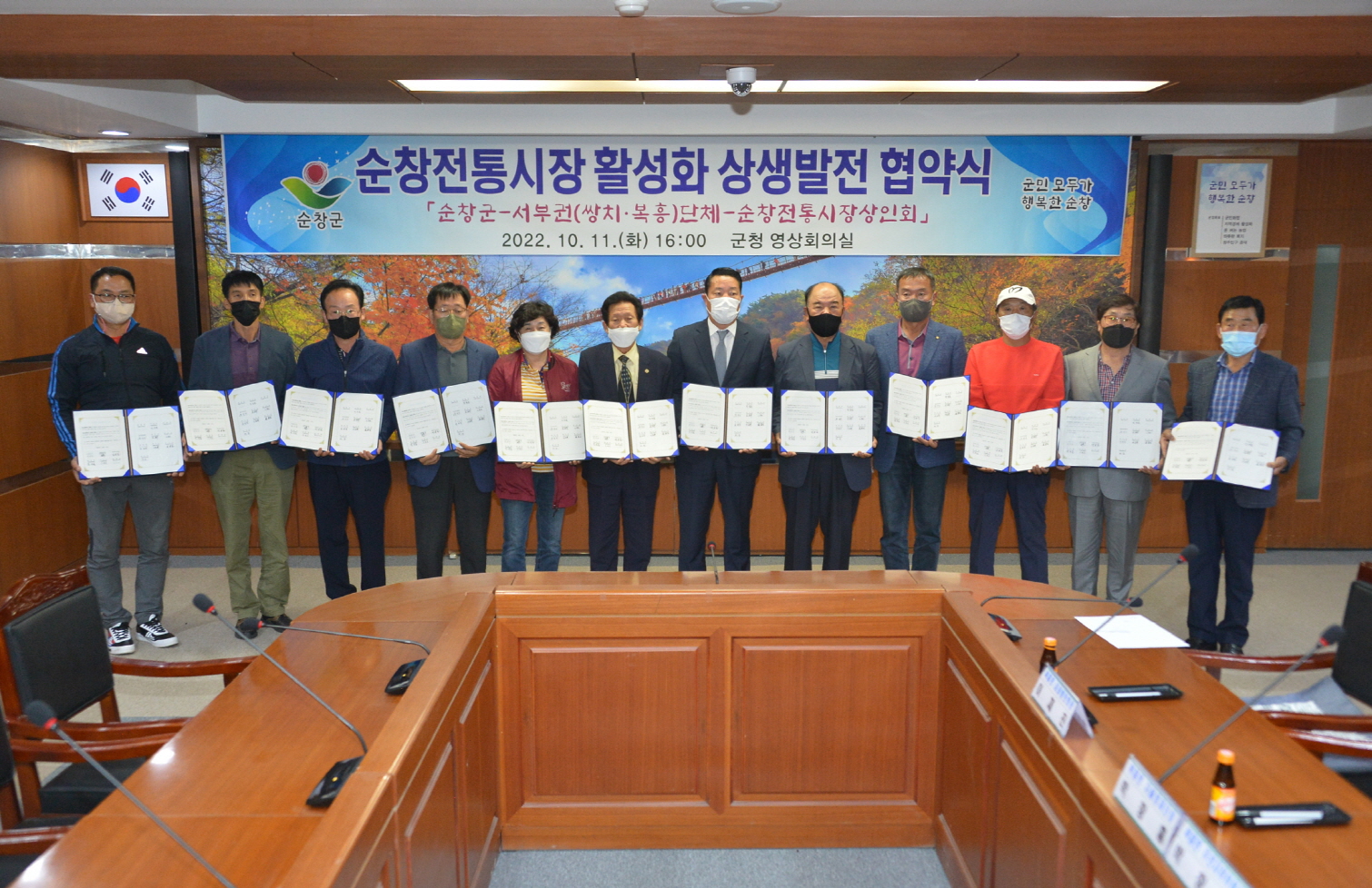 - 순창군과 쌍치·복흥 단체(이하 ‘서부권 단체’), 순창 전통시장 상인회가 11일 순창군청에서 전통시장 활성화를 위한 상생발전 협약식을 가졌다고 밝혔다. 협약식에는 최영일 순창군수, 경제산업국장 등 관계 공무원, 순창 전통시장 상인회장, 서부권 단체 각각의 면민회장, 주민자치위원장, 이장협의회장, 노인회장, 생활개선회장, 자율방재단장, 자율방범대장 등 17명이 참석했다. 이번 협약은 코로나19 장기화로 인한 지역경제 침체, 소비문화 변화 등으로 전통시장 상권이 위축된 상황에서 순창군의 서부권인 쌍치, 복흥 주민들의 공동체 의식을 제고하고 지역화합을 도모하기 위해 진행됐다. 협약 내용은 순창군 전통시장 활성화를 위해 3자 간 협조체계 구축이다. 전통시장 상인회에서는 쾌적한 시장환경 조성과 물가안정에 노력하고, 서부권 단체에서는 지역에서 물건을 구입하고 장보기 행사 등에 참여하여 유대 관계 구축을 다짐하는 내용을 담고 있다. 최영일 순창군수는 “이번 협약을 통하여 지역주민 모두가 전통시장에 관심을 갖고 전통시장 살리기에 노력하면 전통시장 활성화가 자연스럽게 이루어질 수 있는 계기가 될 것”이라고 말했다. 순창 전통시장 상인회장 라병호 회장은 “어려운 시기를 극복할 수 있는 힘이 되어 준 순창군과 서부권 단체에 진심으로 감사한다”고 말했다.