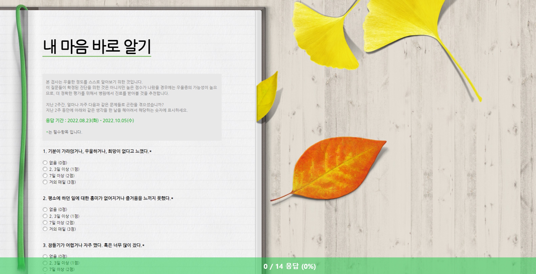 - 순창군은 자살예방의 날과 정신건강의 날 홍보 주간을 맞이하여 10월 5일까지 ‘내 마음 바로 알기’ 비대면 캠페인을 진행하고 있다고 밝혔다. 최근 코로나19로 인한 우울감이 사회적 문제로 대두되는 가운데 이번 캠페인은 지역주민의 마음 건강 위험신호를 조기에 발견하고, 우울증을 예방하기 위해 마련됐다. 캠페인은 순창군민이면 누구나 참여 가능하며 QR코드를 스캔하거나, URL주소(https://naver.me/IDb4O8qF)로 접속하여 우울선별검사를 완료하면 된다. 참여자 중 선착순 100명에게는 소정의 선물을 증정하고, 우울선별검사 결과 고위험자에 대해서는 필요시 개별 마음건강상담을 진행할 예정이다. 순창군보건의료원 정영곤 원장은 “코로나 블루가 증가하고 있는 가운데 자신의 마음 건강 상태를 주기적으로 확인하고, 규칙적인 수면과 식사, 운동으로 생체리듬을 지키는 것이 매우 중요하다”면서 “앞으로도 생명존중과 마음건강을 위한 다양한 프로그램을 제공하여 군민 모두가 건강한 삶을 유지할 수 있도록 최선을 다하겠다”고 말했다.