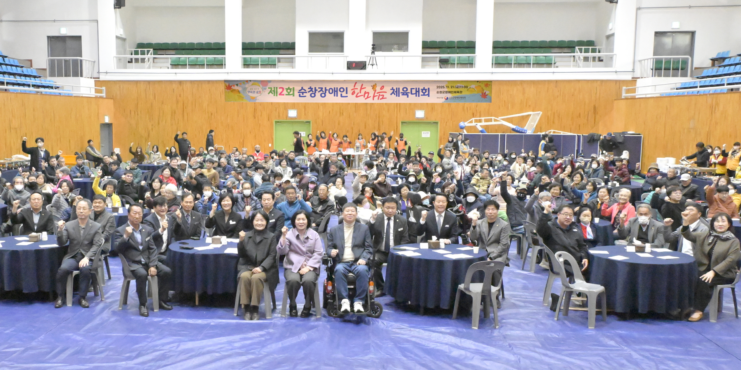 - 순창군 장애인들의 건강 증진과 화합을 위한‘제2회 순창군 장애인 한마음체육대회’가 21일 순창군 장애인체육관에서 성황리에 막을 내렸다. 순창군 장애인체육회가 주최 주관한 이번 대회에는 최영일 순창군수, 손종석 군 의장 및 군의원, 장애인 단체 회장 등 주요 내빈과 선수단을 포함해 총 250명이 참여해 의미 있는 시간을 가졌다. 이날 개회식에서는 내빈 소개와 국민의례, 개회선언에 이어 최영일 군수의 대회사와 내빈들의 축사, 체육경기, 화합 한마당 순으로 진행됐다. 이날 체육경기는 슐런, 보치아 등 장애인 생활체육 종목과 한궁, 투호, 2인 3각, 공 넘기기 등 6개 종목에서 선수단들의 뜨거운 호응속에 열띤 경쟁을 벌였다. 참가자들은 승부를 넘어, 즐거운 신체 활동을 통해 재활 의지를 다지고 서로 소통하며 활력을 나눴다. 특히 다양한 종목을 통해 장애인과 비장애인이 함께 어울려 화합을 이루는 모습은 이번 대회가 장애인 체육 활성화와 삶의 질 향상이라는 본연의 취지를 잘 살렸다는 평가를 받았다. 경기가 끝난 후에는 장애인 댄스팀과 실버댄스팀의 공연이 어우러진 화합 한마당이 펼쳐져 축제의 열기를 더했다. 이어 결과발표 및 시상, 경품 추첨 등 폐회를 끝으로 막을 내렸다. 최영일 순창군수는 개회식을 통해 “오늘 한마음대회는 우리군이 지향하는 따뜻한 복지의 가치를 상징한다”면서 “장애인체육은 단순한 신체활동을 넘어 자립의지를 북돋고 사회 참여의 폭을 넓히는 중요한 역할을 하고 있는 만큼 여러분이 마음껏 기량을 펼치고 건강과 행복을 찾을 수 있도록 장애인체육 인프라 확충에 최선을 다하겠다”고 말했다. 한편, 장애인 한마음체육대회는 2023년 제1회 개최 이래 격년제로 이어지고 있으며, 장애인들의 체력 증진을 도모하고 스포츠를 통해 모두가 하나 되는 화합의 장으로 지역 사회에 긍정적인 가치를 더하고 있다.