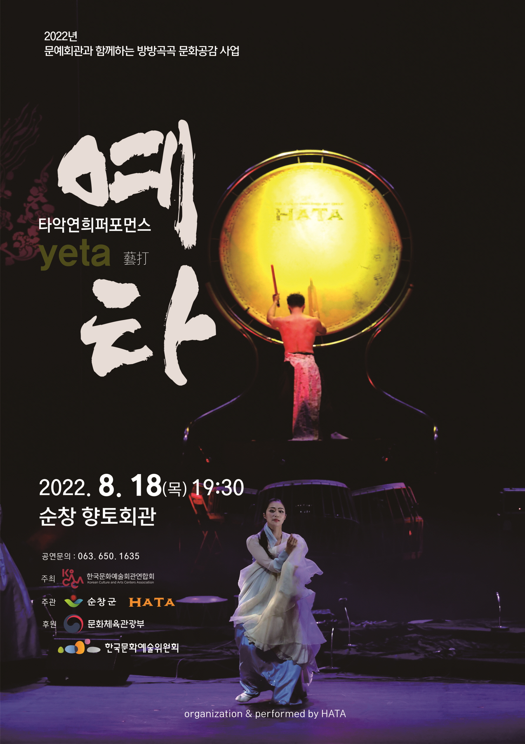 - 순창군이 오는 18일 오후 7시 30분 향토회관에서 타악연희퍼포먼스인‘yeta’ 공연을 진행한다. 타악연희퍼포먼스인‘yeta’는 전통타악은 물론 창작타악, 국악의 신명과 월드뮤직 등 장르를 넘나드는 크로스오버 퓨전공연이다. 새로운 타악의 모습을 끊임없이 연구하고 발전시키는 전문 타악 연주단체인 「HATA」만의 창의적이고 독특한 해석을 통해 동서양이 융합된 강렬한 비트와 자유롭고 역동적인 퍼포먼스가 펼쳐진다. 이번 공연은 전통타악이 가진 신명과 역동성을 바탕으로 새로운 무대 연출과 다양한 연주기법의 고민, 공연내용의 재창조를 통해 한국의 전통타악이 한국은 물론 세계와 더 많이 교류하고 풍부해지는 음악적 계기를 만들고자 기획됐다. 웅장한 울림의 대북 연주, 창작 타악, 사물판굿, 드럼 등의 악기 협연은 물론 전통 타악 연주의 재해석을 통한 창작공연으로 기존의 타악 공연에서는 볼 수 없었던 색다른 볼거리를 제공할 것으로 기대된다. 순창군청 문화관광과 노홍균 과장은“코로나19로 평범한 일상생활마저 위태로워지는 힘든 시기에 타악 연주의 울림과 신명으로 조금이나마 위안이 되었으면 하는 바람으로 이번 공연을 준비했다”고 말했다. 문예회관과 함께하는‘방방곡곡 문화공감 사업’민간예술단체 우수공연으로 마련되는 이번 공연은 한국문화예술회관연합회에서 주최하고 순창군이 주관하며 문화체육관광부와 한국문화예술위원회가 후원한다. 공연 관람에 대한 자세한 사항은 문화관광과 문화예술계(063-650-1635)로 문의하면 된다.