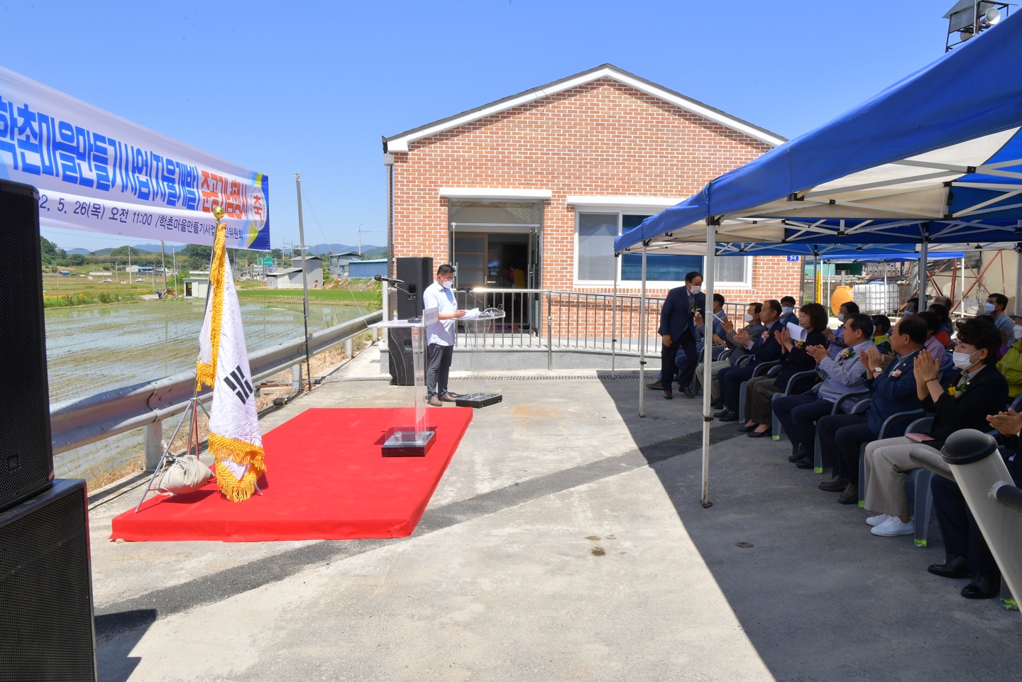 - 순창군이 26일 유등 학촌마을에서 황숙주 순창군수, 신용균 군의회의장, 한국농어촌공사 순창지사장, 지역주민 등 100여명이 참석한 가운데 학촌 마을만들기 사업을 완료하고 준공기념행사를 가졌다고 밝혔다. 학촌마을만들기 추진위원회와 한국농어촌공사 순창지사가 주관한 이날 행사는 유등면 고뱅이 농악단에서 준비한 사전공연을 시작으로 내빈소개, 국민의례, 경과보고, 기념사, 축사, 기념촬영, 주민한마당 행사, 오찬 순으로 진행됐다. 마을만들기 사업은 농촌공간의 효율적․입체적 개발을 통해 농촌 지역 어디서든 기초생활 서비스를 보장함으로써 농촌의 삶의 질을 개선하고, 농촌의 지속가능성을 높이기 위한 창의적 사업 등을 지원한 사업으로 2019년 선정 당시 대통령직속 국가균형발전위원회와 농림축산식품부의 공모사업으로 추진됐다. 총사업비 5억이 투입된 본 사업은 2019년 11월 군과 한국농어촌공사 순창지사가 업무 위‧수탁협약을 맺고 2020년부터 본격적으로 사업을 추진했다. 학촌마을 기초생활기반 확충을 위한 다목적복합공간 조성(주차장 등 1,430㎡), 주민공동생활관 증축, 마을 경관정비 등을 완료하여 2022년 5월 학촌 마을만들기 사업을 준공하여 이날 준공식을 갖게 됐다. 군 관계자는 “마을만들기 사업을 통해 기초생활 기반 확충으로 주민 삶의 질 향상은 물론, 이번 사업으로 구축된 주민공동생활관 등 편의시설을 활용하여 주민공동체가 더욱 활성화 될 것이 기대된다”면서 “사업의 무탈한 마무리를 위해 애써 준 모든 분께 감사하다”고 밝혔다.