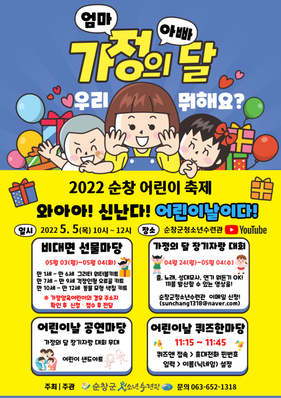 - 순창군은 제100회 어린이날을 맞아 코로나19 감염에 취약한 어린이의 건강과 안전을 위해 지난해에 이어 올해도 어린이날 행사를 비대면으로 진행한다고 밝혔다. 이번 행사는 순창군청소년수련관(관장 김병수)에서 사전행사로 선물꾸러미(만들기 키트)를 5월 3일과 4일 2일간 관내 어린이집, 유치원, 초등학교 등에 전달하고 가정양육 어린이의 경우 청소년수련관에서 배부할 예정이다. 행사당일인 5월 5일은 10시에서 12시까지 온라인 동영상 매체인 유튜브를 활용해 행사가 진행된다. 유튜브를 통해 어린이 장기자랑대회, 축하공연(샌드아트공연, 초등부 댄스 공연), 퀴즈이벤트 등이 진행되며 장기자랑과 퀴즈이벤트 우수 대상자로 선정된 어린이에게는 순창사랑상품권을 지급한다. 양병삼 주민복지과장은 “어린이들의 안전과 건강을 위해 어린이날 행사를 비대면으로 진행하게 되었다”며 “많은 어린이와 가족들이 유튜브를 통해 가정에서 안전하게 즐길 수 있는 뜻깊은 행사가 되기를 바란다”고 말했다. 기타 행사관련 자세한 내용은 순창군청소년수련관(063-652-1318)으로 문의하거나 홈페이지(sunchang1318.com)를 통해 확인할 수 있다.