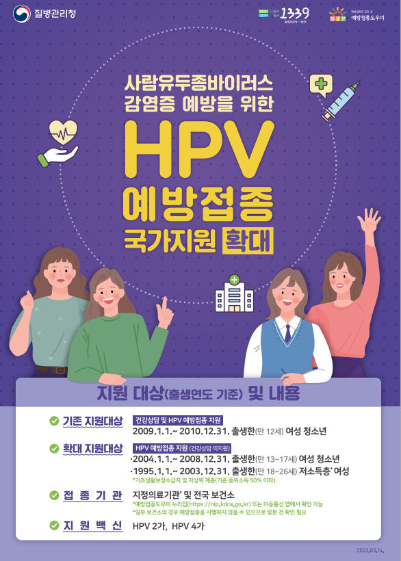 - 순창군이 사람유두종바이러스(HPV) 무료 예방접종 대상자를 확대한다고 밝혔다. 기존 사람유두종바이러스 접종 무료 대상은 만 12세 이하 여성 청소년(2009. 1. 1 ~ 2010. 12. 31. 출생자)이었지만, 이번 접종 대상자 확대로 만 13~17세 여성청소년(2004. 1. 1. ~ 2008. 12. 31. 출생자)과 만 18~26세 저소득층 여성(1995. 1. 1. ~ 2003. 12. 31. 출생자)도 무료로 접종받을 수 있게 됐다. 국가예방접종 지원 백신은 HPV 4가(가다실)이며, 기존 지원 대상자인 만 12세 여성청소년에게는 예방접종비와 건강상담이 모두 지원되고, 확대 지원대상자는 예방접종비만 지원되어 건강상담비는 본인이 부담해야 한다. 예방접종은 순창군보건의료원 예방접종실과 관내 1개소 지정의료기관 복흥 우리가정의원(☎653-7580)에서 받을 수 있다. 다만, 저소득층의 경우 접종 당일 저소득층확인 서류(기초생활보장수급자, 차상위계층 자격확인서)를 지참해 방문하여야 한다. 기타 자세한 예방접종에 관한 문의는 보건의료원(☎650-5994)로 문의하면 된다. 한편, 자궁경부암은 15∼34세 여성에게 발생하는 암 가운데 3번째로 높은 발생률을 보이는 암이며 사람유두종바이러스(HPV) 감염이 원인이 되므로 HPV 예방접종과 정기적인 자궁경부암 검진을 통해 예방이 가능하다.