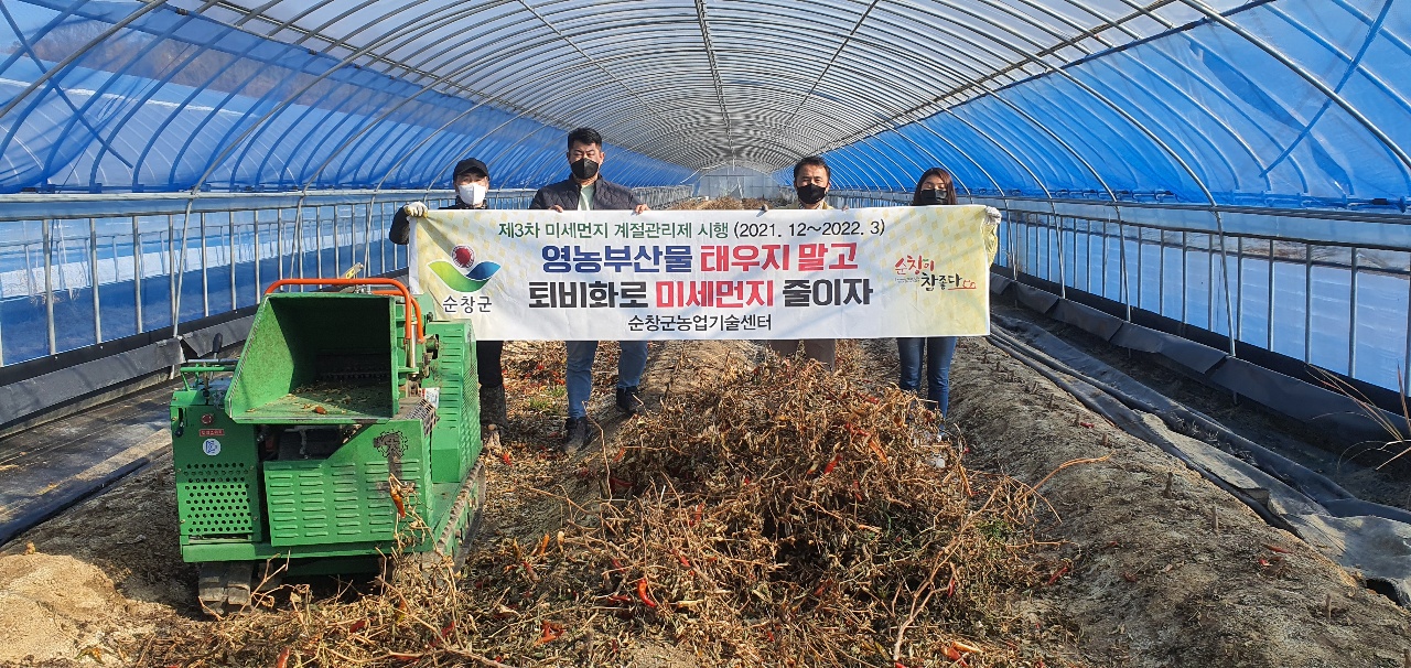 - 순창군이 영농부산물 재활용으로 미세먼지 없는 깨끗한 농촌만들기 실천에 팔을 걷어부쳤다. 군은 고춧대 및 영농 폐비닐 등 영농 부산물 불법 소각 금지를 위한 현수막 게첨 및 자원 재활용 방안에 대해 농업인들 대상으로 현장지도에 전념하고 있다. 특히 미세먼지가 심한 올 3월까지를 중점 지도기간으로 정하고 이 시기에 주로 이루어지는 논두렁 밭두렁 태우기를 금지하고 있다. 또한 고춧대 및 과수 전정가지를 태우지 않고 파쇄하여 퇴비로 활용할 수 있는 방안과 영농폐비닐의 효율적 수거 방안 등에 대해서 농업인들을 직접 방문하여 지도하고 있다. 군은 이를 효율적으로 추진하기 위해 농기계임대사업소와 연계하여 잔가지 파쇄기를 농업인들이 편리하게 사용 할 수 있도록 기본정비를 마친 상태다. 군은 농업인들에게 농기계를 임차해 줄 때 농기계 안전교육과 미세먼지 저감 교육을 병행하여 농업인들의 미세먼지 저감에 대한 인식을 높이는 동시에 친환경 영농실천에 적극 나설 방침이다.