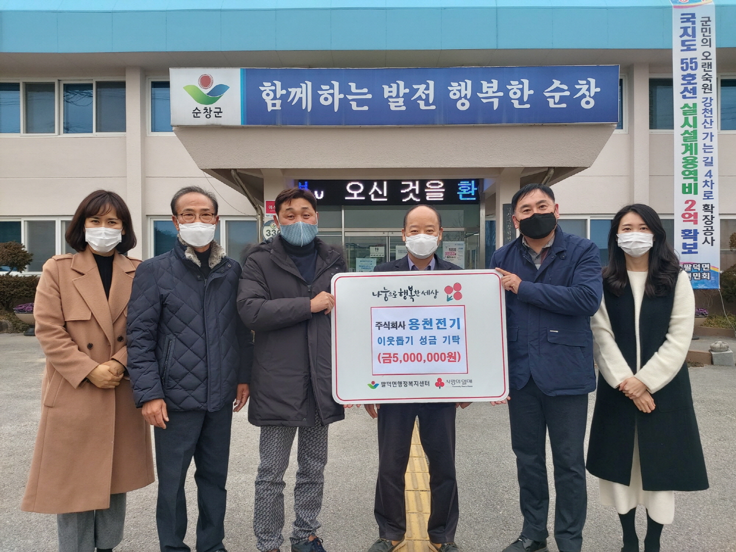 - 순창군 팔덕면에 새해에도 어려운 이웃을 위한 나눔활동이 이어지면서 사랑의 온도가 상승하고 있다. 용천전기(이병진 대표)는 지난 5일 팔덕면행정복지센터를 방문해 어렵고 소외된 이웃을 위해 써달라며 성금 500만원을 기탁했다. 이번 성금은 용천전기 직원 모두가 지난해 십시일반 모금해 마련한 것으로 그 의미가 크다. 용천전기는 팔덕면에 소재하고 있으며 현재 전신주 등을 설치하는 전기 전문업체로 매년 직원들이 자발적으로 월급의 일부를 모아 선행을 베풀며 지역사회의 귀감이 되고 있다. 용천전기 관계자는 “코로나19 및 겨울철 한파로 어려움을 겪고 있는 소년소녀가장 등 소외계층에게 조금이나마 도움이 됐으면 좋겠다”고 말했다. 이에 권해수 팔덕면장은 “불우이웃돕기 성금을 기탁해 준 용천전기 이병진 대표 및 직원들에게 진심으로 감사드린다”며 “기탁한 소중한 성금은 주변의 어려운 주민에게 잘 전달하겠다”고 화답했다.
