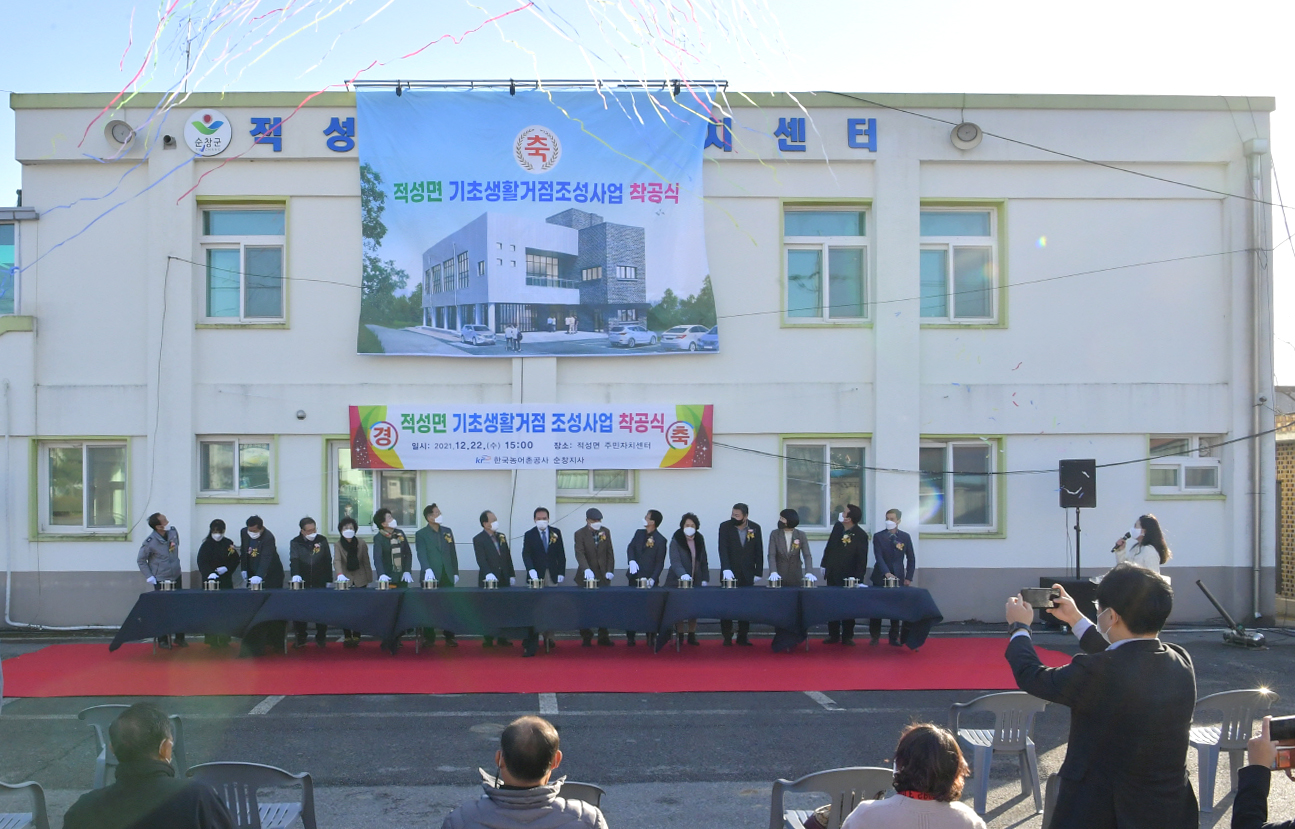 - 22일 적성면 주민자치센터에서 적성면민들의 숙원사업인 적성면 기초생활거점조성사업 착공식을 개최했다. 이날 착공식에는 황숙주 군수를 비롯한 신용균 순창군의회 의장, 최영일 전북도의회 부의장. 순창군의회 의원, 내․외빈과 주민 등 40여 명이 참석했다. 적성면 기초생활거점 조성사업은 농촌 지역의 거점공간인 지역 소재지에 교육, 문화, 복지, 생활편익 시설 등을 종합적으로 확충하기 위해 농식품부에서 추진하는 공모사업으로, 지난 2018년 순창 적성면이 대상지로 선정됐다. -2021년 12월 22일-
