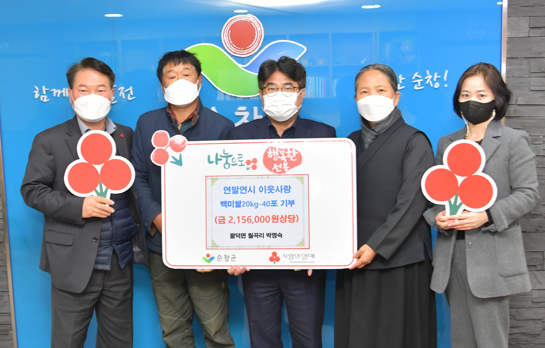 - 21일 순창군청 주민복지과 직원들로, 2021년 지자체 합동평가 우수부서 포상금 160만원 전액을 주변의 불우이웃을 돕고자 기부했다. 주민복지과는 지자체 합동평가에서 순창군 소속 전체 16개 부서 중 1위로 최우수상을 받아 160만원의 포상금을 받았다. -2021년 12월 21일-