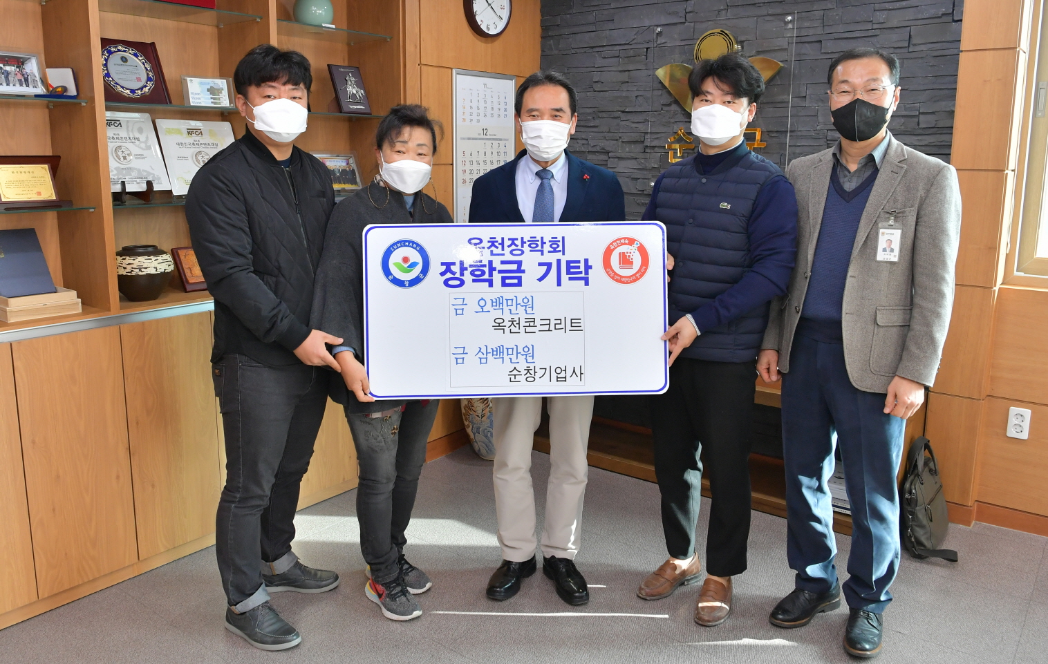- 22일 옥천콘크리트(대표 서명옥)와 순창기업사(대표 봉성배)가 순창군청을 방문해 지역의 인재를 위한 장학금으로 써달라며, 각각 성금 5백만원과 3백만원을 전달했다. -2021년 12월 23일-