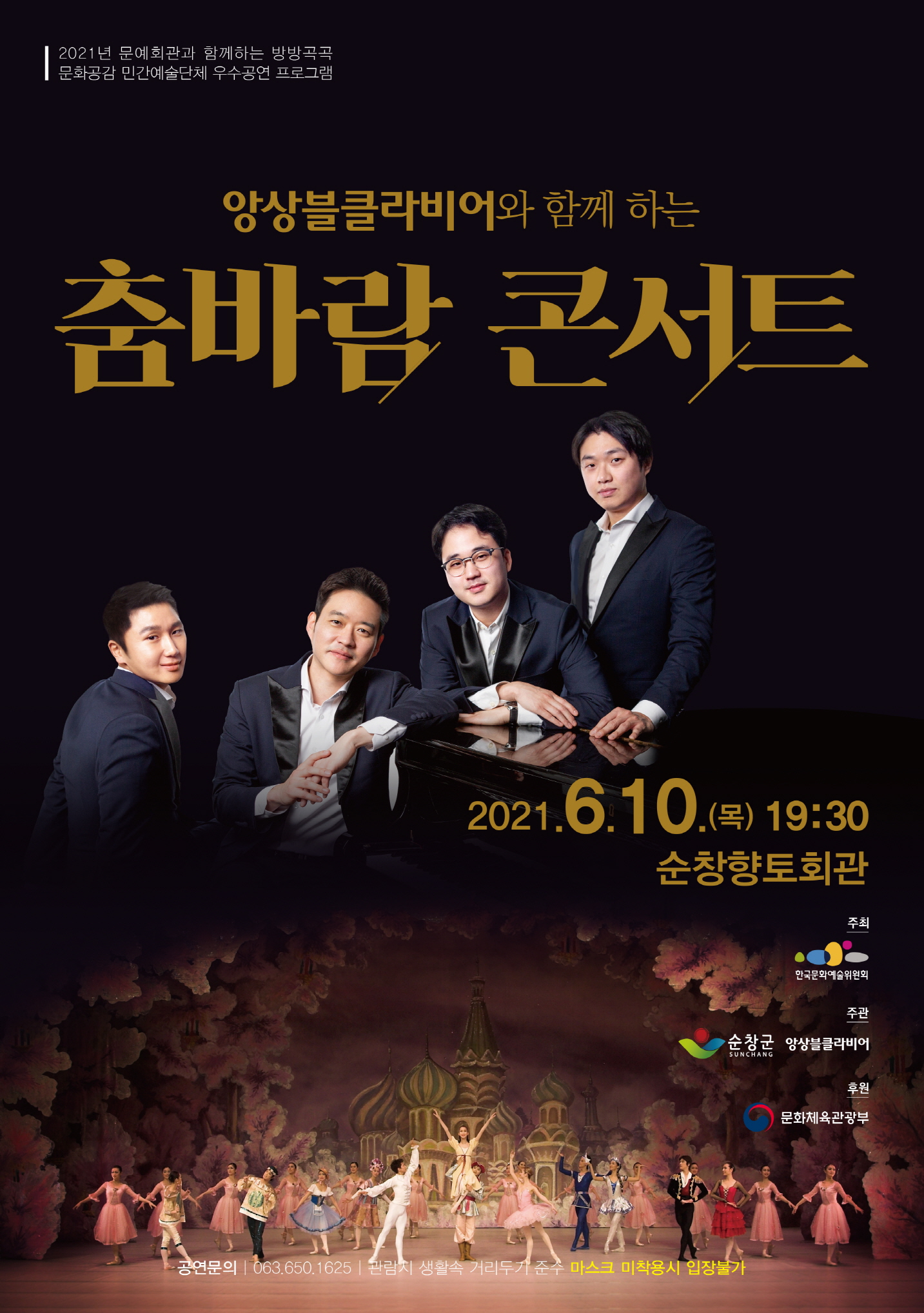 - 순창군이 오는 10일 피아노의 선율에 흠뻑 젖을 수 있는 ‘앙상블 클라비어와 함께하는 춤바람 콘서트’를 연다. 공연은 저녁 7시 30분, 향토회관에서 진행하며 코로나 19 확산방지를 위해 관람객은 마스크 미착용시 입장이 불가하다. 군은 전체 465석인 공연장 내 관객 간 거리두기를 위해 115석만 사용할 예정으로, 관람객 입장은 선착순으로 진행된다. 공연은 방방곡곡 문화공감 사업을 통해 전국적으로 활발한 활동을 이어가고 있는 ‘앙상블 클라비어’에서 작품을 선보일 예정이다. 이번 공연은 4명의 피아니스트가 피아노를 연주하고 무용수들은 이에 맞춰 왈츠. 탱고, 발레를 춤추는 음악과 댄스가 함께 어우러진 공연이다. 연주곡은 일상에서 한번쯤은 들어봤던 곡을 선정해 클래식에 대한 거부감을 없앴다. 이번 공연을 통해 클래식과 친해질 수 있는 계기가 될 전망이다. 공연 관람에 대한 자세한 사항은 문화관광과 문화예술계(063-650-1625)로 문의하면 된다.