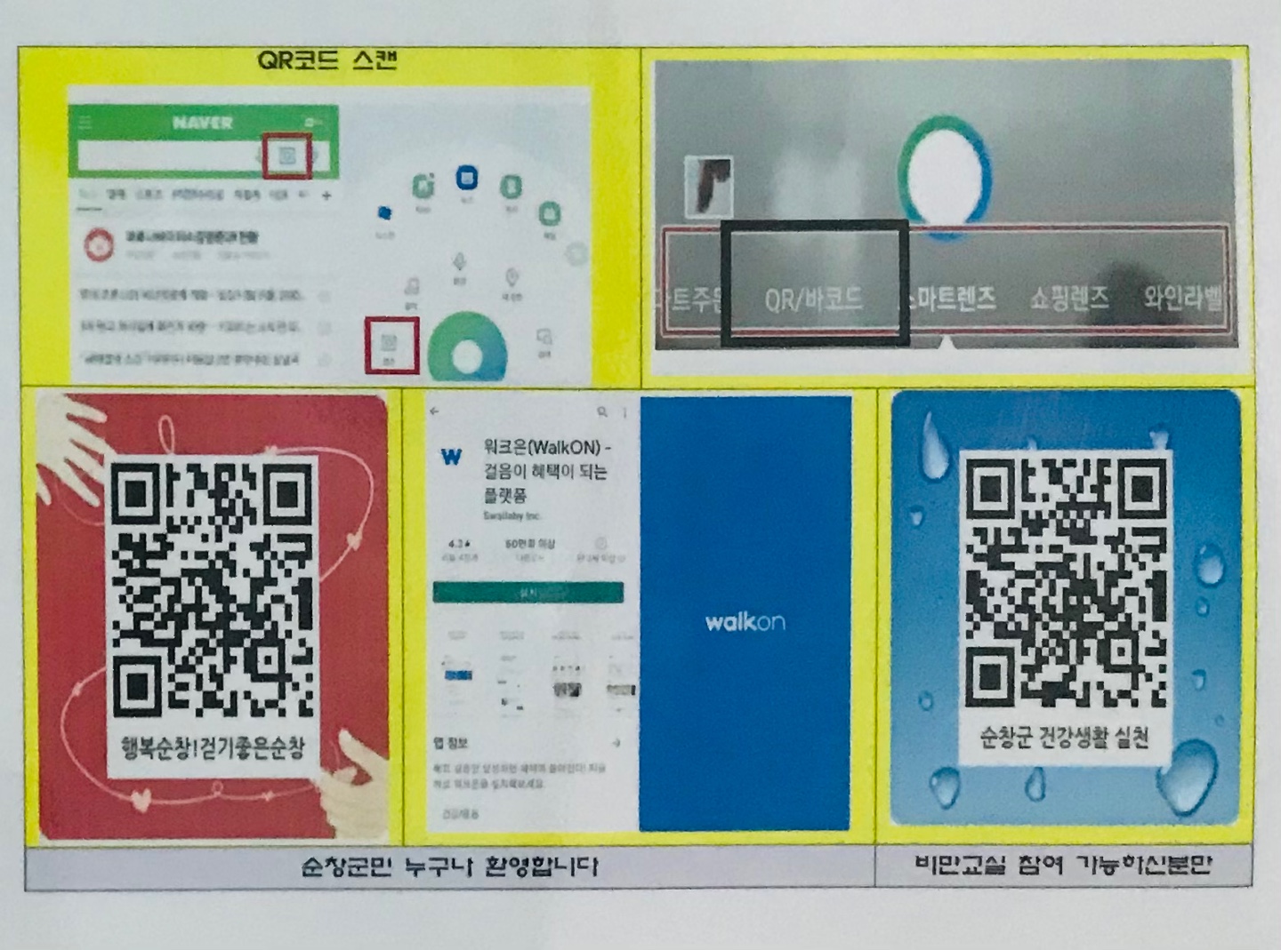 - 순창군보건의료원이 올해도 걷기실천 향상 및 비만도 개선을 위해 건강생활실천 운동을 추진한다. 순창군보건의료원은 코로나19 확산 이후 비대면 프로그램 개발과 비대면 건강관리를 시행하면서 모바일 앱인 ‘워크 온’을 활용했지만 모바일 환경에 익숙치않은 주민들이 어려워하는 부분이 있었다. 이에 순창군보건의료원이 군민들이 손쉽게 ‘워크 온’앱을 설치하고 활용할 수 있도록 QR코드를 활용키로 했다. 코로나19 시대에는 QR코드 스캔이 일상이 되어 버린 만큼 네이버 QR코드나 바코드를 인식해 누구나 손쉽게 필요한 정보를 얻을 수 있다. 이제 군민들은 스마트폰으로 QR코드만 찍으면 손쉽게 앱에 가입할 수 있어 건강정보와 걷기 운동에 동참할 수 있게 됐다. QR코드는 순창군청 홈페이지와 네이버 밴드 ‘순창군보건의료원’에서 확인할 수 있다. 또한 군은 네이버 밴드인 ‘순창군보건의료원’을 활용해 프로그램 대상자 관리와 건강정보를 제공하고 있으며, 이를 통해 지역주민의 건강관리와 순창군 걷기 활성화에 기여하고 있다. 순창군보건의료원 정영곤 원장은 “지역주민의 많은 관심과 호응을 바라며, 더 많은 군민들이 참여하고 소통하는 공간에서 건강 생활 실천을 통해 일상생활을 회복했으면 좋겠다”고 말했다. 기타 자세한 사항은 보건의료원 건강증진계(☎ 650-5212, 5231)로 문의하면 된다.