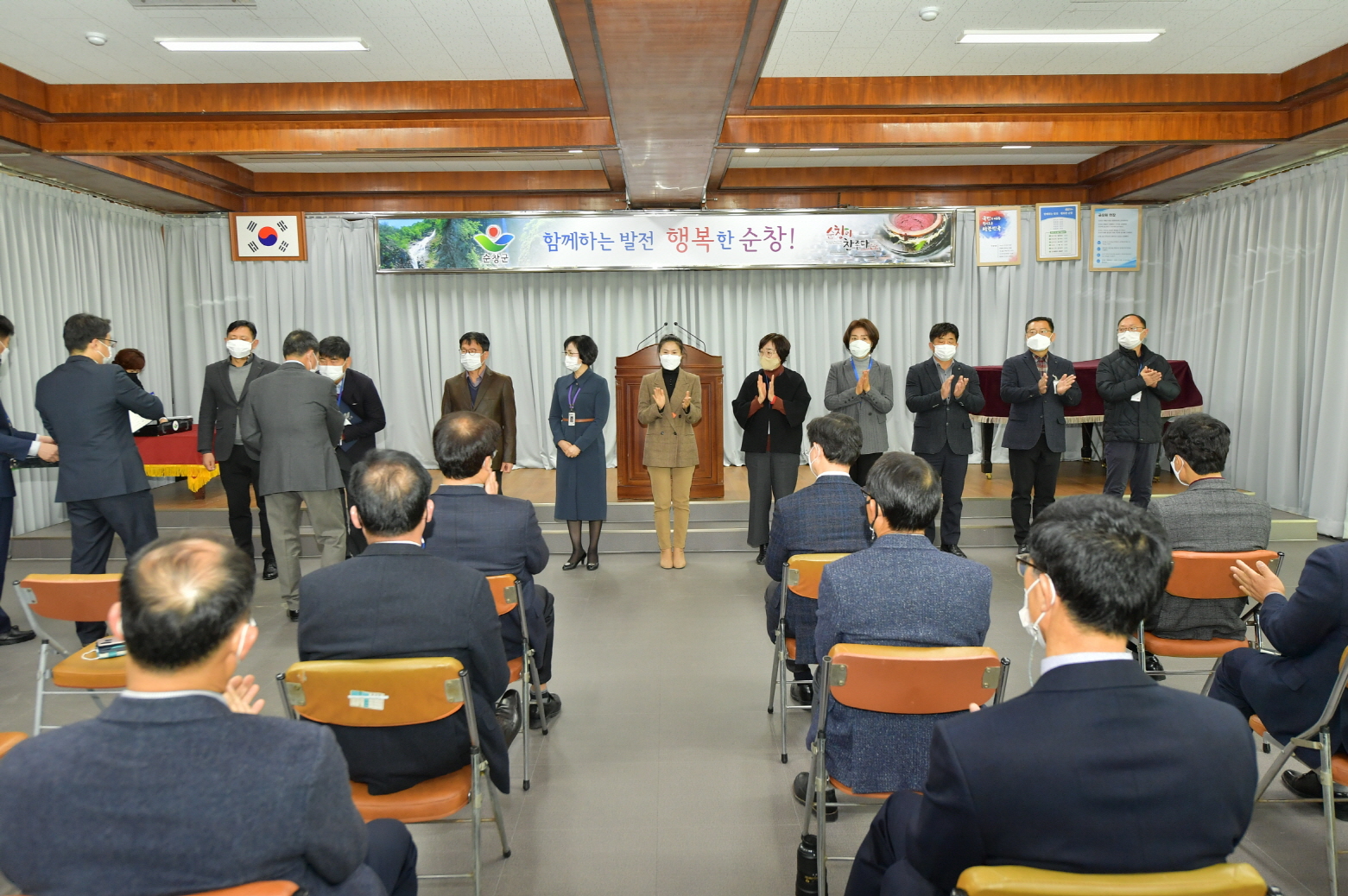 - 순창군이 지난 1일 군청 3층 대회의실에서 12월 월례조회를 가졌다. 사회적 거리두기 1.5단계임을 감안해 간부급 공무원과 표창 대상자만 회의장에 참석했고, 회의장에 참석하지 못한 공무원들은 청내 방송으로 청취했다. 이날 월례조회에는 코로나19로 인해 농업인의 날 행사와 순창장류축제 등이 취소되면서, 순창군민을 위한 표창 시상이 많이 이뤄졌다. 농산업발전을 기여한 공로를 인정받아 명인고추장 박현순 대표가 국무총리 표창을 수상했다. 이어 농촌 생활개선 및 지도분야에서는 한국농촌지도자 전라북도연합회 김형준 부회장과 생활개선순창군연합회 임인숙 대표가, 농업인의 날 군정발전 유공분야에는 순창읍 임영진씨 등 11명이 순창군수 표창을 수상했다. 클린순창 만들기 종합 1위 적성면 지북마을 등 10곳에 대한 시상도 이어졌다. 황숙주 순창군수는 서두에 “코로나19로 인해 올 한해 업무를 추진하는데 어려움이 많았다”면서 “올 한해도 얼마남지 않았으니 연말까지 그동안 해왔던 업무들이 부족한 부분이 없는지 꼼꼼히 챙겨줄 것”을 당부했다. 이어 지난달에 있었던 종자산업 기반구축 공모사업과 도시재생 뉴딜 공모사업 선정, 온라인 당뇨캠프, 라이브 커머스 농산물 판매 성공 등에 대한 관계부서와 직원들을 격려했다. 황 군수는 인사말씀에서 “내년도 본 예산안에 4,400억원을 세웠지만 막판까지 국가예산 확보를 위해 끝까지 대응을 잘해주길 바란다”고 밝혔다. 이어 “현재 진행되고 있는 군의회 2차 정례회도 세심하게 준비할 것”도 주문했다. 그는 마지막으로 공자가 언급한 삼계도(三計圖)를 인용하면서 “일년지계(一年之計) 재어춘(在於春)하고, 춘약불경(春若不耕)이면 추무소망(秋無所望)이라”면서 “내년도 해야 할 일에 대한 계획을 미리 세워 대비해야 한다”고 언급했다. 이어 “올해 코로나19 뿐 아니라 내년도 기후변화로 인해 어떤 재난이 일어날지 모른다”면서 “미리 대비하는 자세를 갖춰, 내년도 업무추진에도 차질이 없도록 해달라”고 덧붙였다.