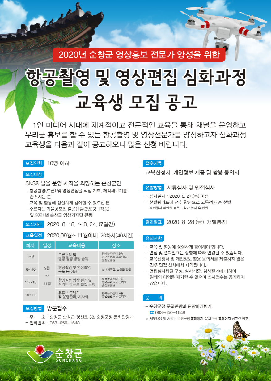 - 순창군이 항공촬영과 영상편집에 관심있는 순창군민을 모집한다. 군은 1인 미디어 시대에 체계적이고 전문적인 교육을 통해 순창군 홍보에 적극 활용하고자 영상홍보 전문가 양성과정을 개설했다. 교육은 오는 9월부터 11월까지 총 20회에 걸쳐 진행되며, 드론원리부터 항공 촬영방법, 촬영구도, 영상편집 등 영상전문가 양성을 위한 기초과정이 아닌 심화 과정으로 준비했다. 영상편집 교육은 전문 영상편집시설을 갖춘 청년콘텐츠 스튜디오에서 진행해 실제 영상산업 현장에서 쓰이는 기술을 습득할 수 있도록 현장감을 높였다. 이번에 모집하는 교육인원은 전체 10명 이내로, 오는 24일까지 교육을 희망하는 순창군민은 순창군청 문화관광과를 방문해 접수하면 된다. 군은 1차 서류심사와 2차 면접심사를 거쳐 오는 28일 합격자를 선정해 개별통지할 예정이다. 이번 교육생으로 선정되는 군민에게는 내년도 순창군 영상기자단으로 활동할 수 있는 특전도 주어진다. 군은 이번 교육을 통해 지역내 영상전문가를 양성해 점차 늘고 있는 영상 홍보 시스템을 더욱 다양화 할 수 있는 계기가 될 것으로 판단하고 있다. 군 관계자는 “유튜브, 인스타그램 등 SNS채널을 통한 홍보가 점차 중요해지고 있어 이번 교육과정을 준비했다.”면서 “영상 전문가에 관심 있는 순창군민들의 많은 참여를 바란다”고 밝혔다. 자세한 사항은 군청 홈페이지를 참고하거나 문화관광과 관광마케팅(063-650-1648)로 문의하면 된다.