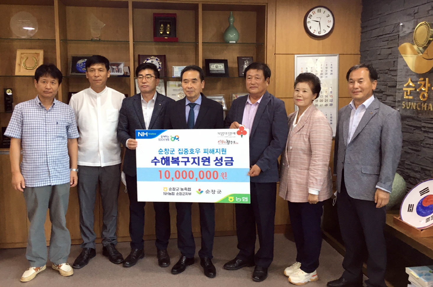 - NH농협 순창군지부(지부장 장경민)와 순창군 농·축협 조합장(순창농협 선재식, 구림농협 이두용, 동계농협 양준섭, 서순창농협 박상칠, 순정축협 고창인)은 20일 순창군을 방문해 수해복구지원 성금 1천만원을 전달했다. 장경민 지부장은 “유례없는 집중호우로 농가들의 시름이 깊어가고 있다”며 “범농협 역량을 결집해 조속한 복구가 이루어질 수 있도록 최선을 다하겠다”고 말했다. 이어 황숙주 순창군수는 “호우피해 주민들을 도우려는 주변의 따뜻한 손길이 이어지고 있어, 주민들도 큰 힘을 얻고 있다”면서 “행정에서도 하루 속히 일상으로 되돌아갈 수 있도록 최선을 다하겠다”고 밝혔다.