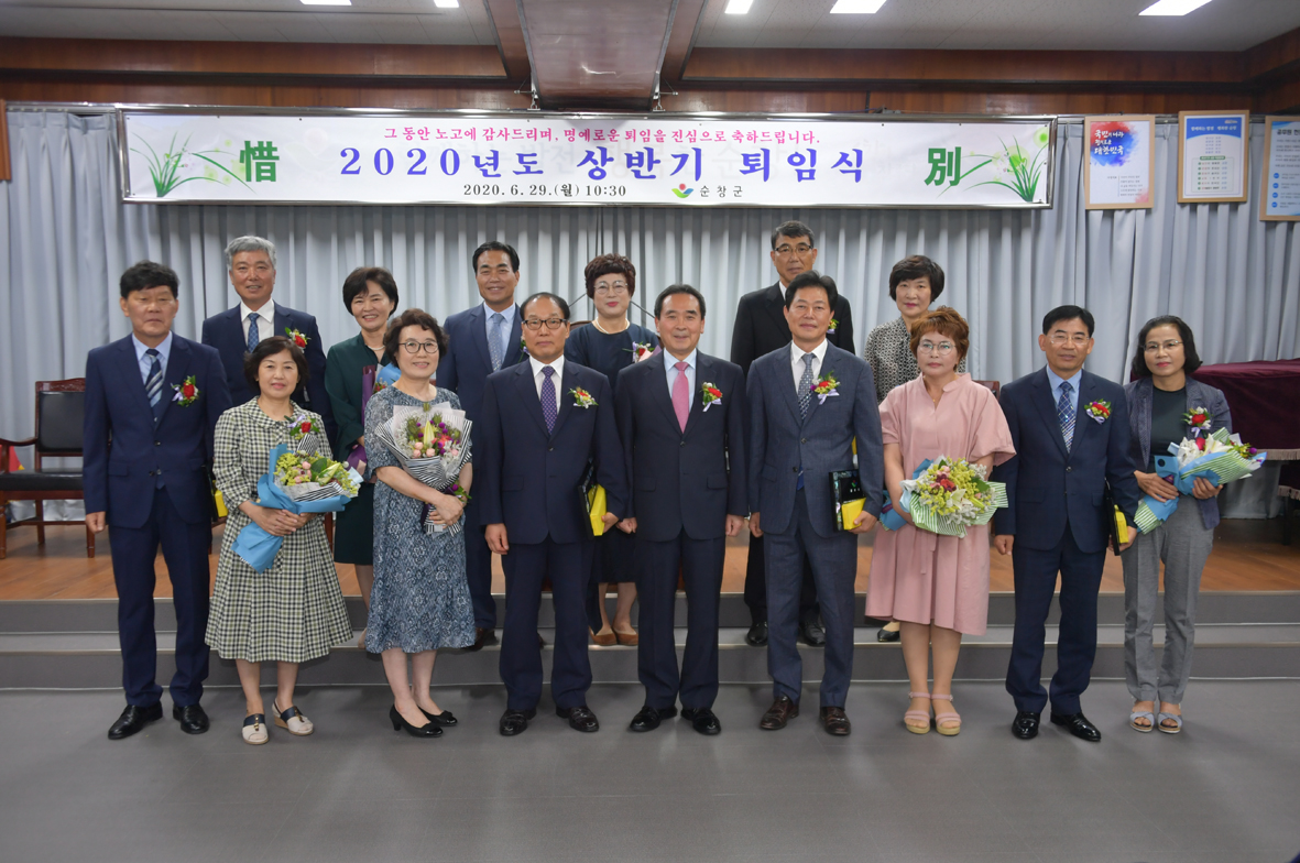 - 순창군이 지난 29일 군청 3층 영상회의실에서 퇴직공무원 7명이 참석한 가운데 올해 상반기 퇴임식을 가졌다. 이날 참석한 퇴직자들은 적게는 30년부터 많게는 40년까지 군민에게 봉사하는 공직생활을 이어왔다. 그 끝맺음을 갖는 뜻 깊은 자리에 후배 공무원 200명도 자리를 함께해 정든 군청을 떠나는 선배 공무원의 노고를 위로했다. 오전 10시 30분부터 진행된 이번 퇴임식은 국민의례와 공로패 전달, 군수 축하인사, 퇴임 소감 등의 순으로 진행됐다. 과거 사진을 영상으로 만들어 상영하는 동안 공직생활을 되돌아보던 퇴직자들은 눈시울이 붉어졌다. 황숙주 순창군수도 이날 참석해 퇴직자들의 앞으로 다가올 미래의 안녕과 건강을 기원했다. 황숙주 순창군수는 “30~40여년을 묵묵히 공직에서 순창군 발전을 위해 희생하신 퇴직자분들의 노고에 박수드린다”며 “퇴직후에도 순창군에 아낌없는 사랑과 새로운 세계로 나아가는 퇴직자들의 미래에 희망이 가득차길 바란다”고 전했다. 퇴직자 대표로 이구연 전 기획예산실장이 단상에 올라 후배 공무원들에게 조언을 아까지 않았다. 이 전 실장은 “단결과 화합, 시대흐름의 선점, 자기분야에서 최고의 전문가가 되어주길 바란다”고 전했다. 이어 “순창의 미래를 책임질 미생물, 친환경, 치유 산업 등을 꼭 성공시켜 순창군 발전을 이끌어 나가줄 것”을 당부했다.